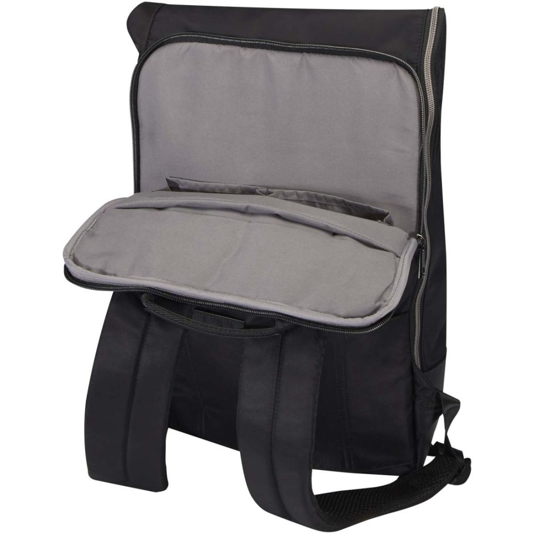 La mochila enrollable te permite alternar a la perfección entre el trabajo y el ocio gracias a su elegante estilo y versatilidad. Fabricada con nylon reciclado con certificado GRS de alta calidad, suave forro de RPET y elementos de cuero de poliuretano de primera calidad. La mochila cuenta con un compartimento específico para portátil de 15” con 2 bolsillos adicionales para accesorios electrónicos, un compartimento principal con una práctica entrada con cremallera en L y 2 bolsillos, un bolsillo frontal organizador con cremallera y un bolsillo lateral. Disfruta de la máxima comodidad de transporte con las correas acolchadas y ajustables y el asa superior envuelta en poliuretano. Capacidad: 18 litros. Resistencia para hasta 10 kg de peso. Sin PVC.
