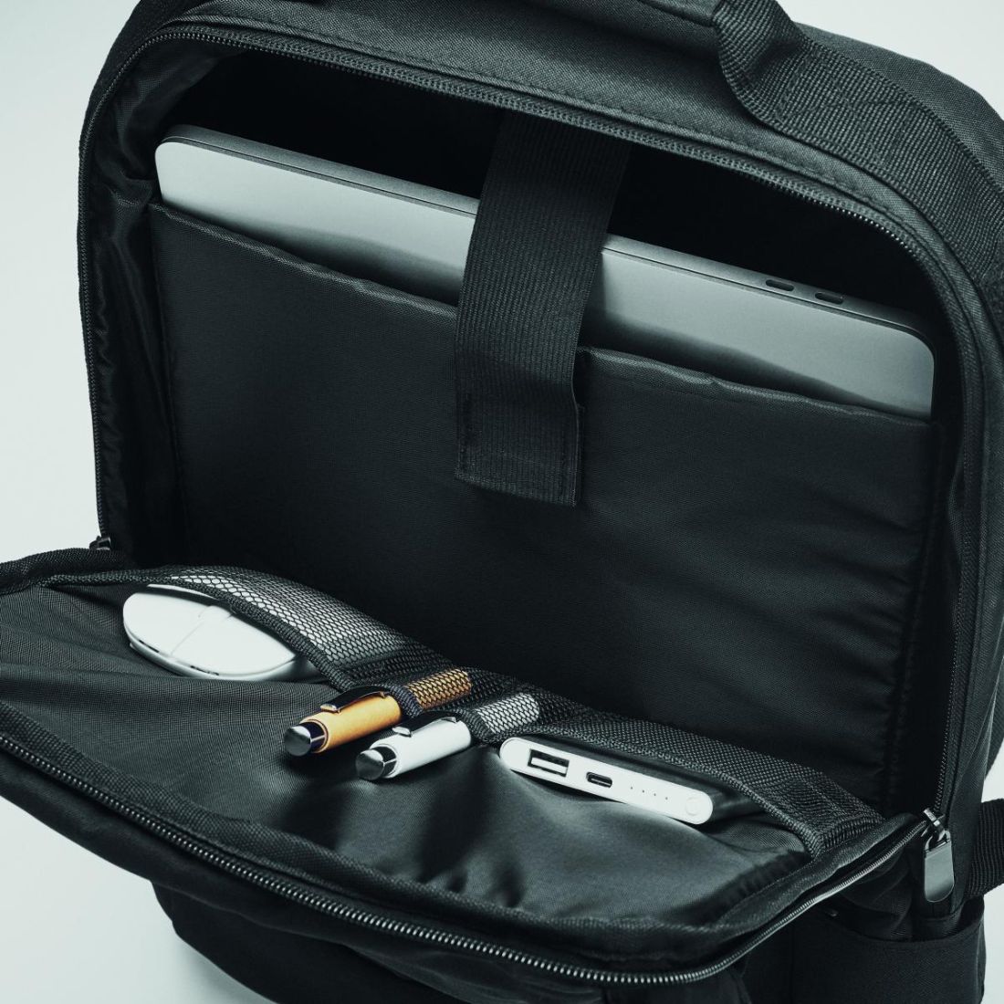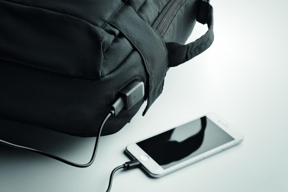 Mochila para portátil en poliéster RPET 300D con correa de hombro acolchada con asa y bolsillo lateral. Incluye un compartimento interno principal para un portátil de hasta 16' con conector USB tipo-A y cable para conectar tu powerbank (no incluido).