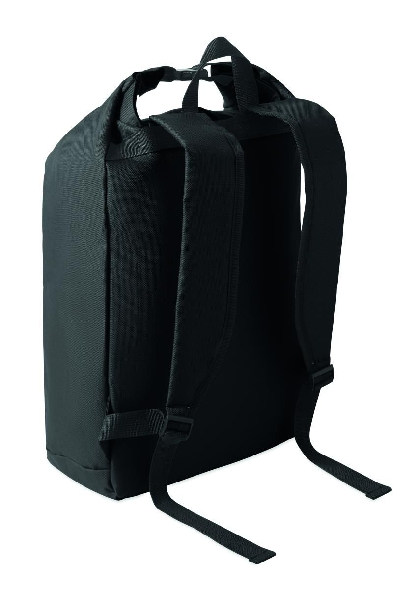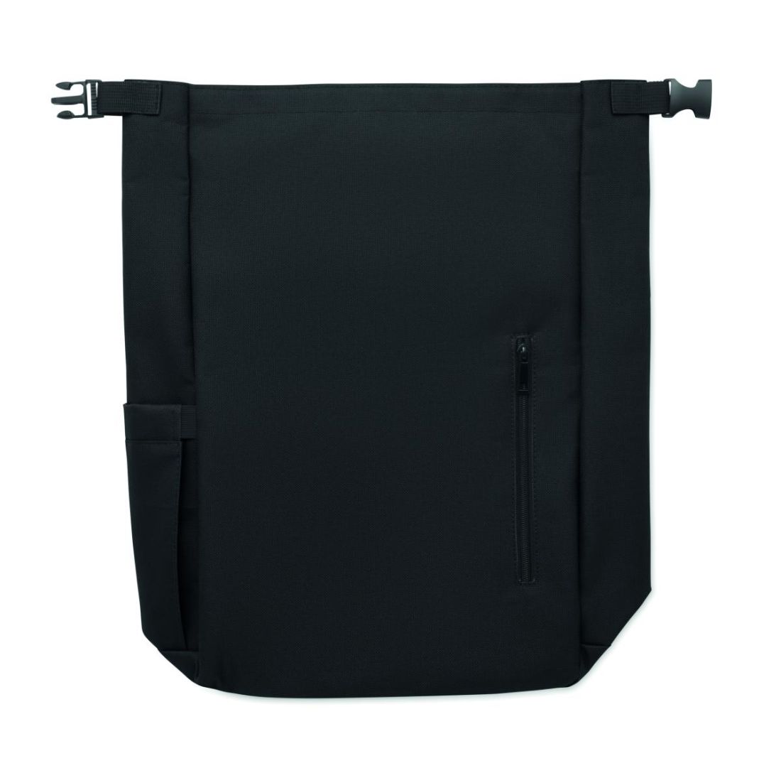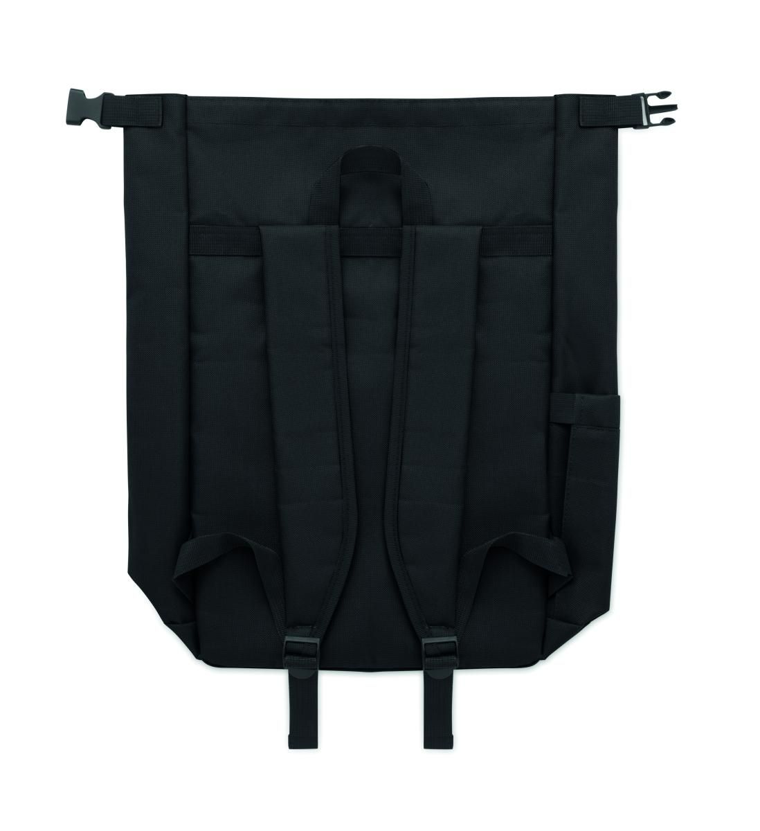 Mochila roll top para portátil de 15 pulgadas de poliéster RPET 600D con forro acolchado RPET 210D. Bolsillo frontal con cremallera, bolsillo lateral elástico y correas ajustables para los hombros.