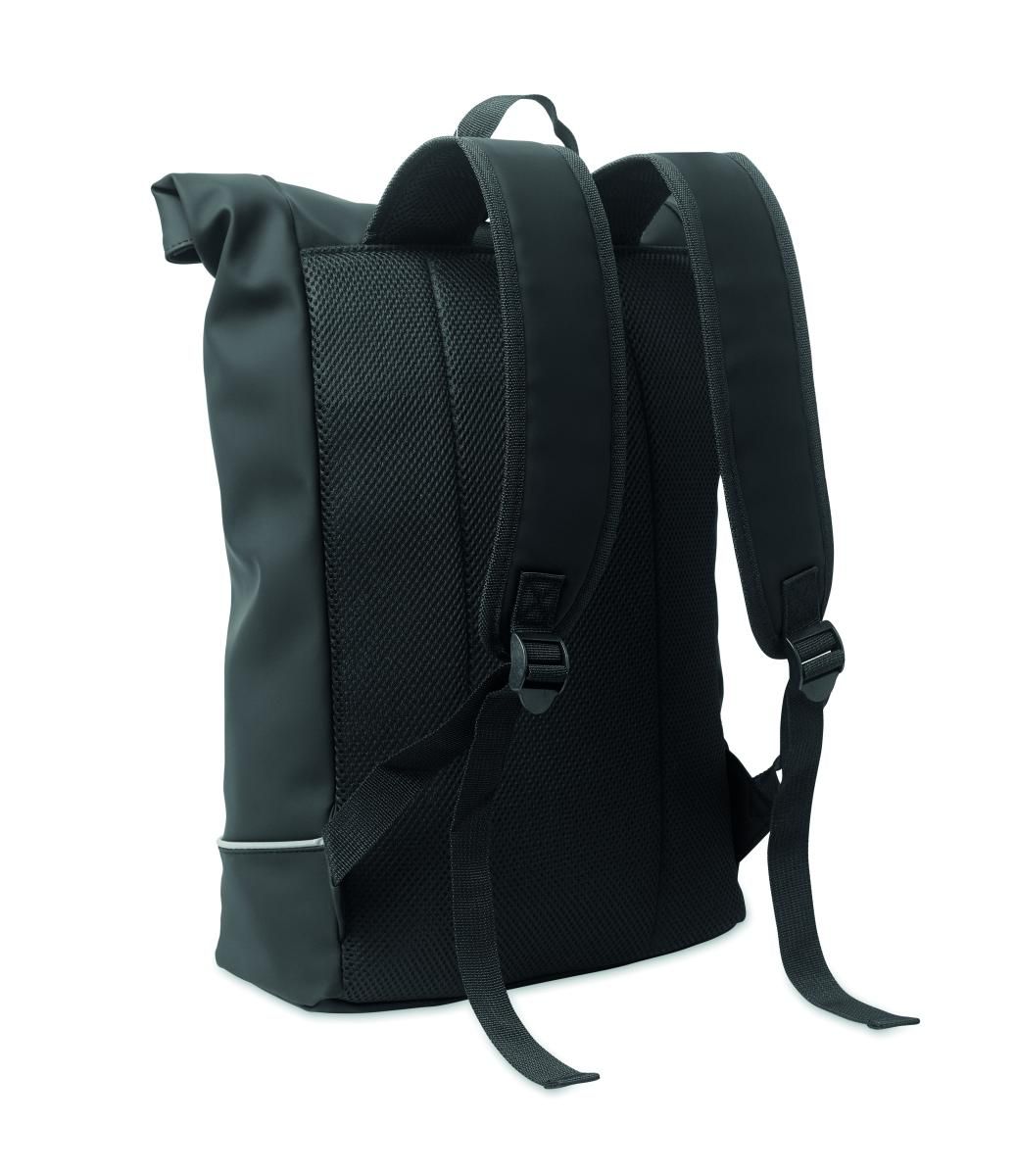 Mochila con cierre rolltop para portátil de 15'' en suave PU con respaldo acolchado y refuerzo en la base con banda reflectante. Bolsillo frontal impermeable con cremallera. Forro de poliéster RPET 210D.