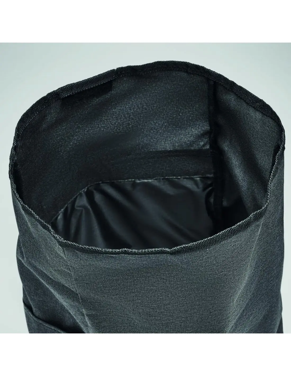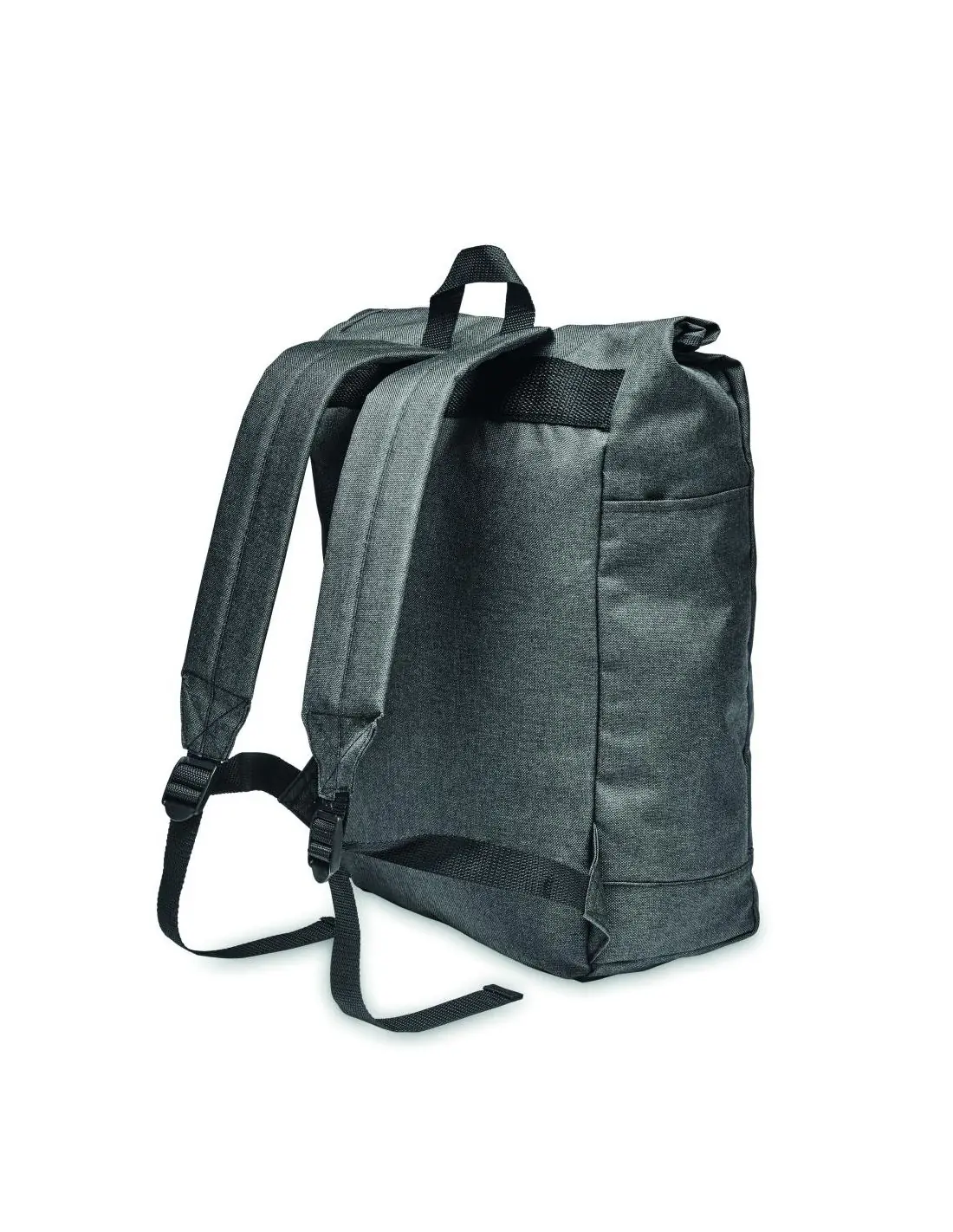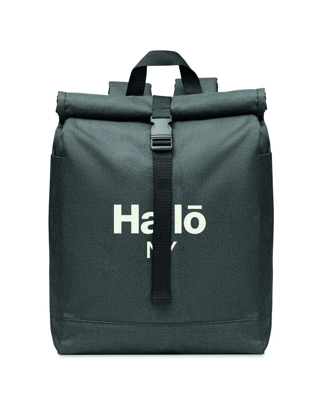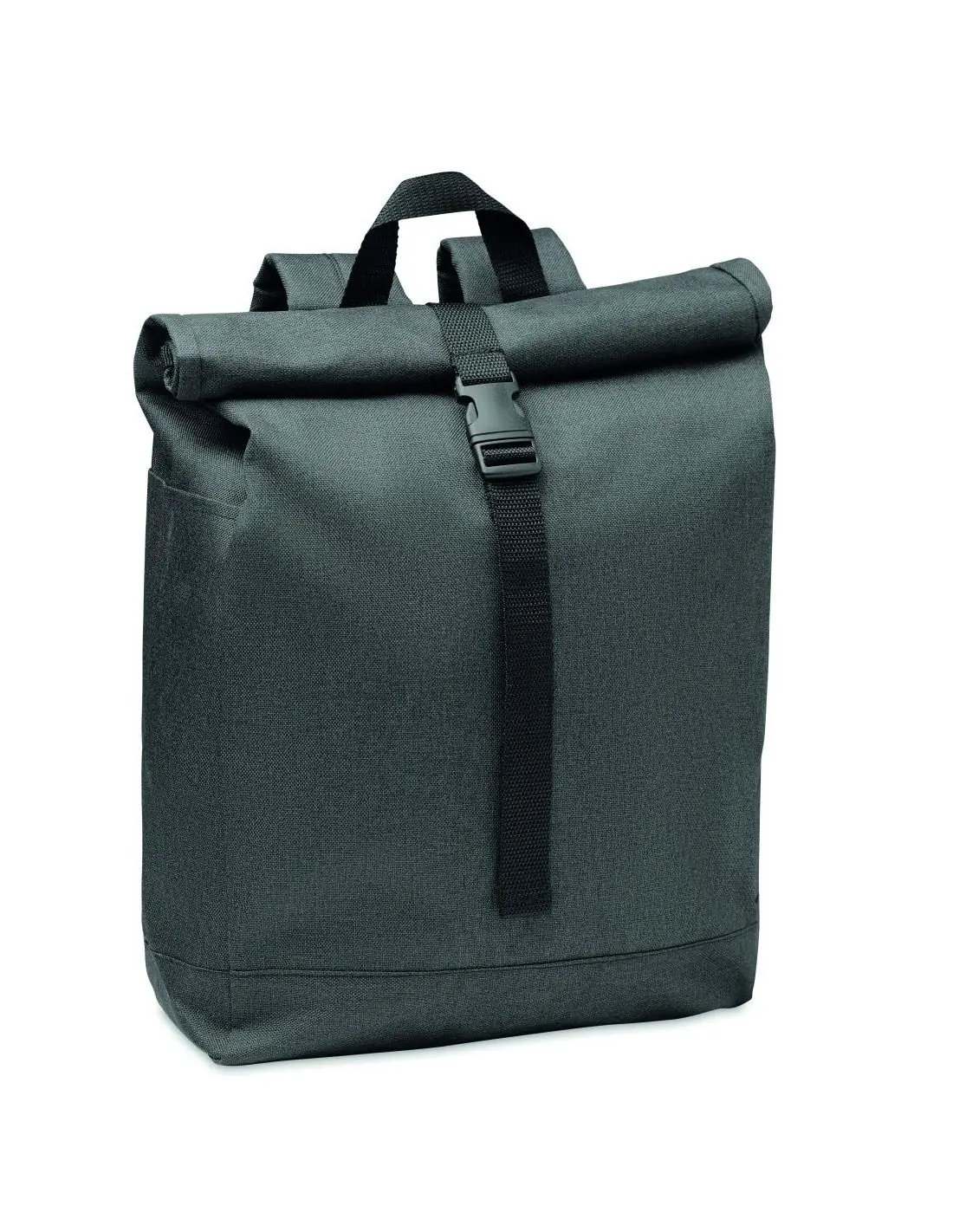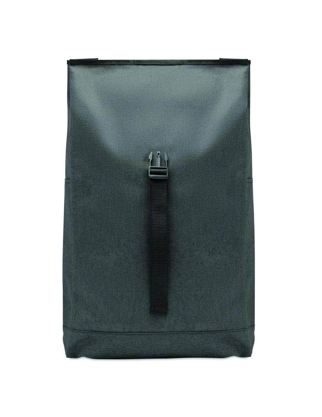 Mochila de poliéster 600D RPET jaspeada con cierre roll top.