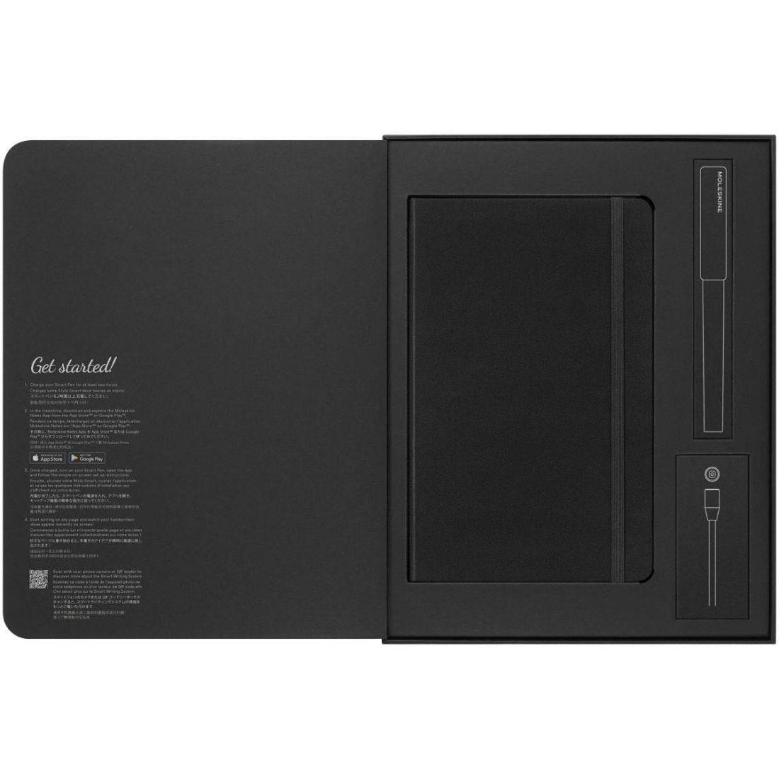 El set escritura inteligente contiene la libreta clásica más vendida (grande y con rayas), un bolígrafo inteligente, un cargador magnético y un recambio. ha detectado que en nuestra vida cotidiana utilizamos instintivamente una combinación de herramientas analógicas y digitales. El set de escritura ofrece el placer de escribir a mano en papel con los beneficios de lo digital, para que puedas tomar notas, dibujar o planificar. Se entrega con la sencilla aplicación Moleskine Notes, que permite una edición, organización y uso compartido sencillos en cualquier momento y lugar. El bolígrafo moderno y de forma elegante viene con un cargador magnético de creación exclusiva, una batería que dura 24 horas y un agarre cómodo para poder escribir durante más tiempo. Con Ncodes invisibles en cada página, el bolígrafo Smart puede identificar la ubicación exacta en la libreta y crear una versión digital idéntica de tus notas en la pantalla, lista para editarse, expandirse y compartirse digitalmente.