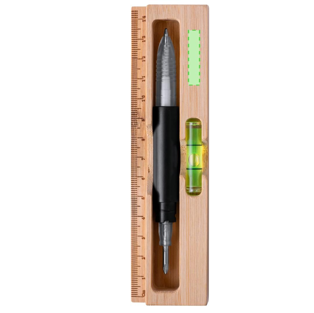 Práctica multiherramienta de 5 funciones, fabricada en resistente acero al carbono y acabado en color negro. Con funciones destornillador (punta plana y philips) y bolígrafo con tinta azul (cartucho jumbo). Presentada en resistente estuche de bambú, con nivel integrado y regla. Presentada individualmente en caja de diseño kraft.