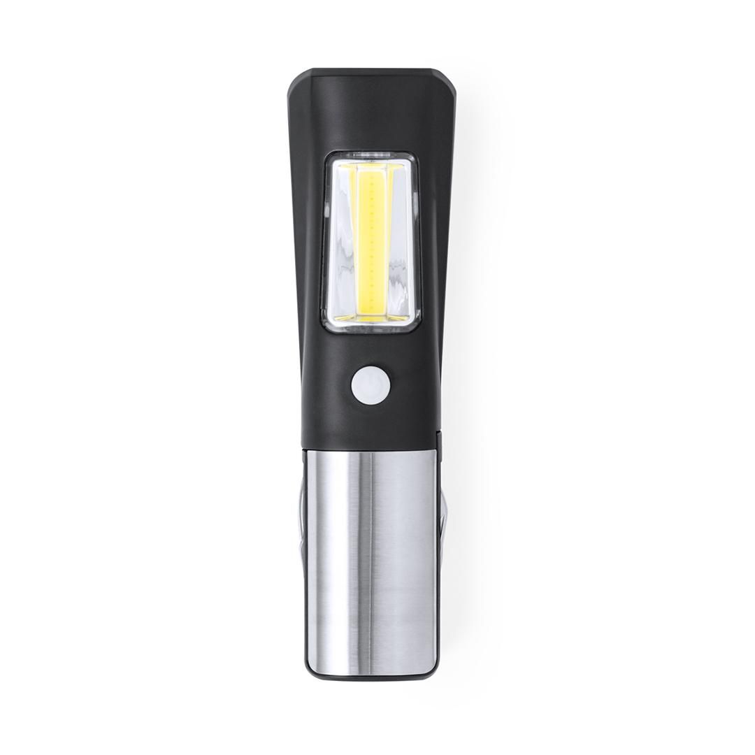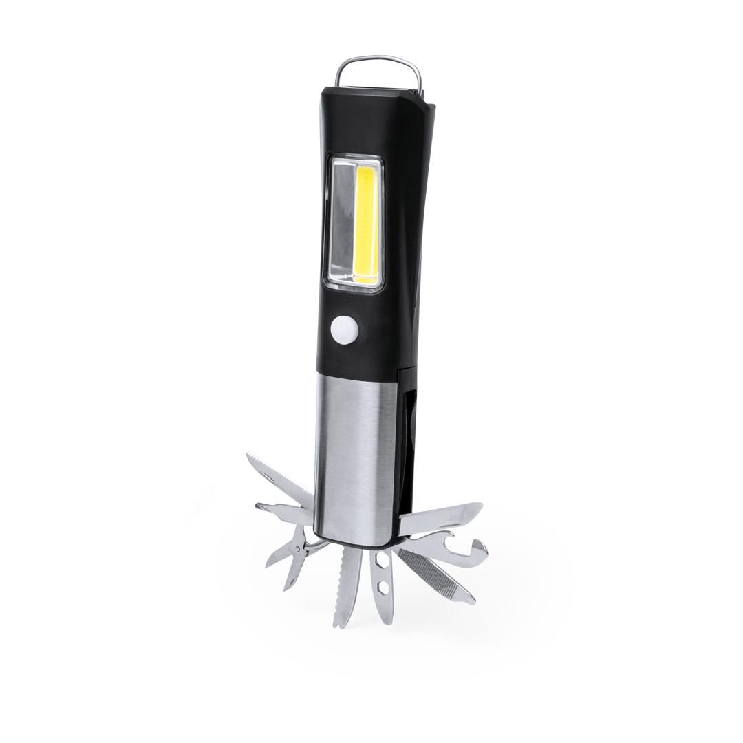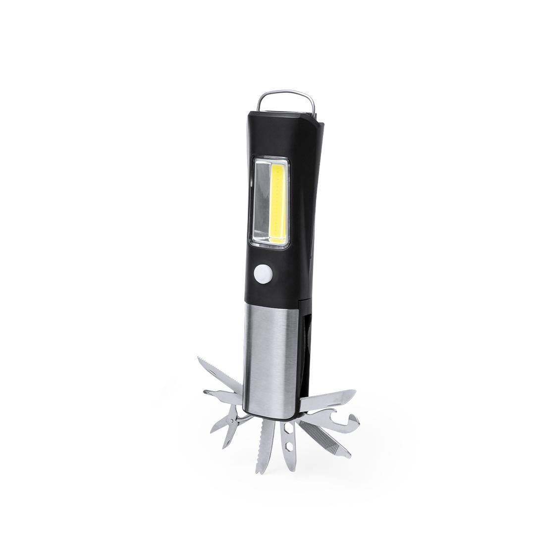 Práctica multiherramienta fabricada en resistente ABS y acero inox, con linterna frontal integrada de 1 LED. Incluye linterna lateral de 19 luces COB...