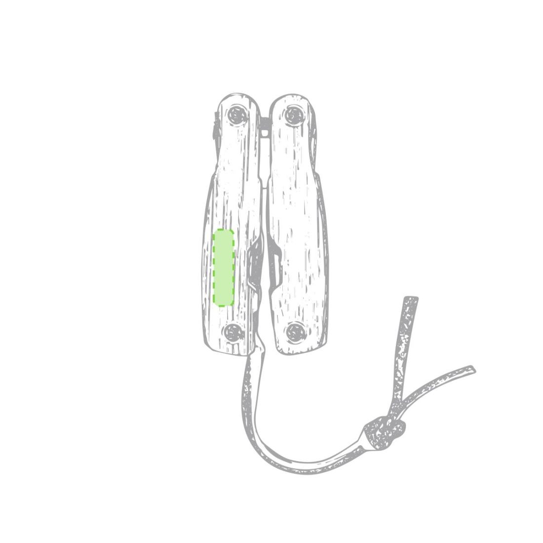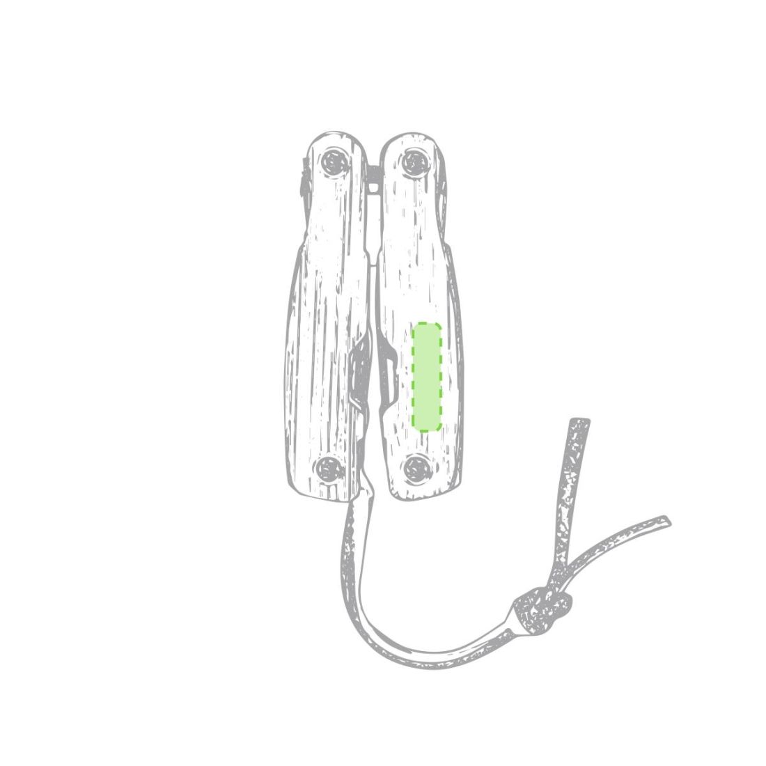 Multiherramienta con resistente cuerpo en acero inox y empuñadura de bambú, con 12 funciones. Incluye cuchillos y navajas destornilladores, limas abridores y alicates. Con cinta para transporte en polipiel y presentada en caja individual.