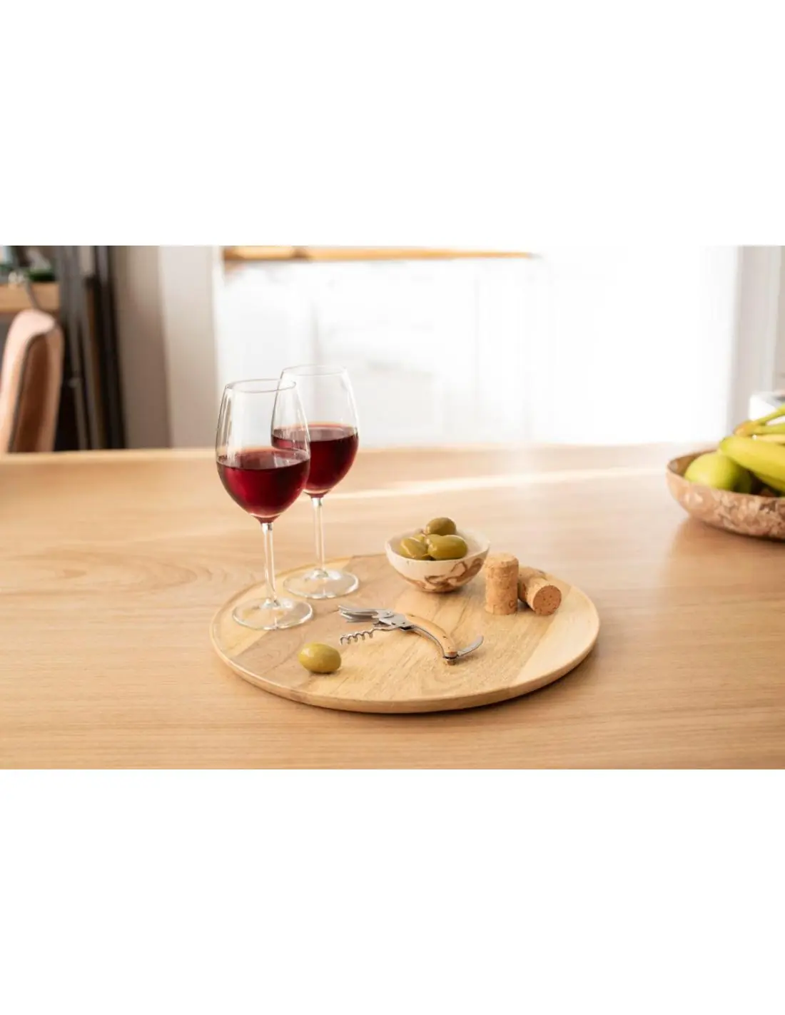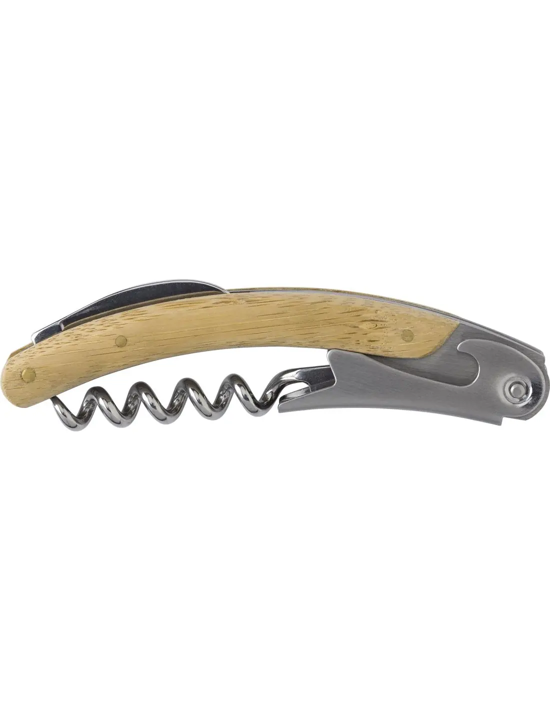 Abrebotellas, sacacorchos y navaja, de bambú y acero inoxidabe.