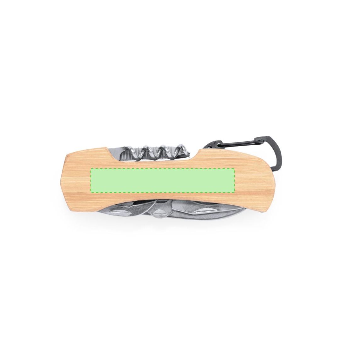 Navaja multiusos fabricada en acero inox y suave bambú. Con 9 funciones que incluyen cuchillo, tijeras, abrelatas, sacacorchos, destornillador philips, destornillador plano, lima y abrebotellas. Además, cuenta con un práctico enganche en forma de mosquetón. Presentada en caja de diseño kraft. Materiales como el bambú fomentan la utilización de materias primas naturales, reduciendo las emisiones contaminantes. Proviene de una planta de gran resistencia y versatilidad, con crecimiento y regeneración rápidos, siendo una excelente alternativa al uso de madera tradicional.