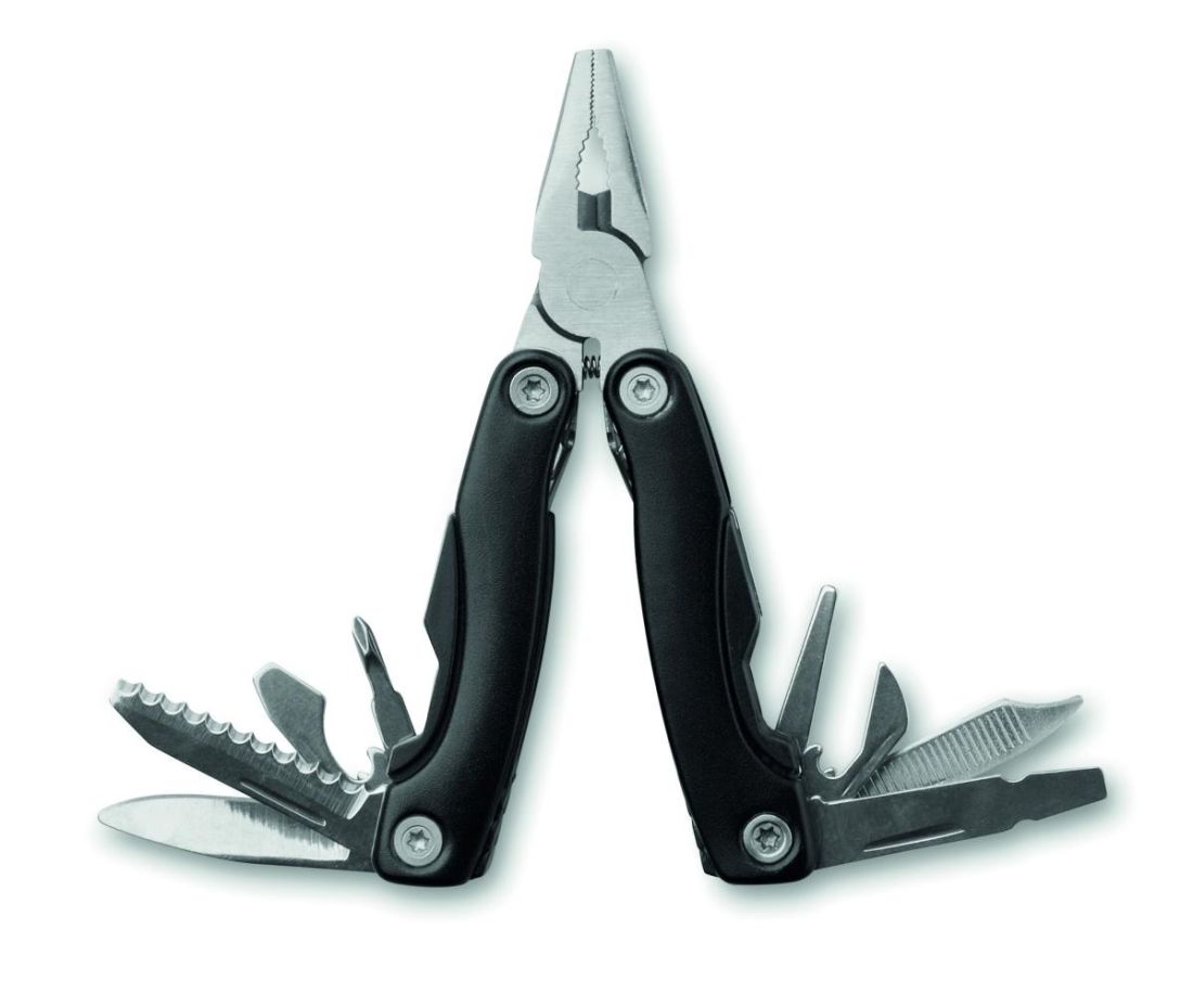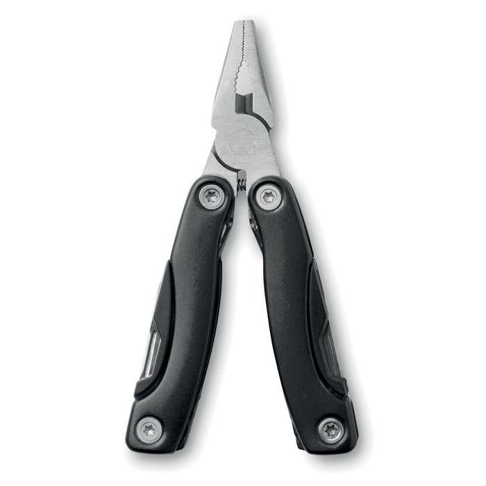 Multi herramienta plegable en acero inoxidable con alicates de acero inoxidable. Con 9 funciones. Presentado en funda poliéster 600D.
