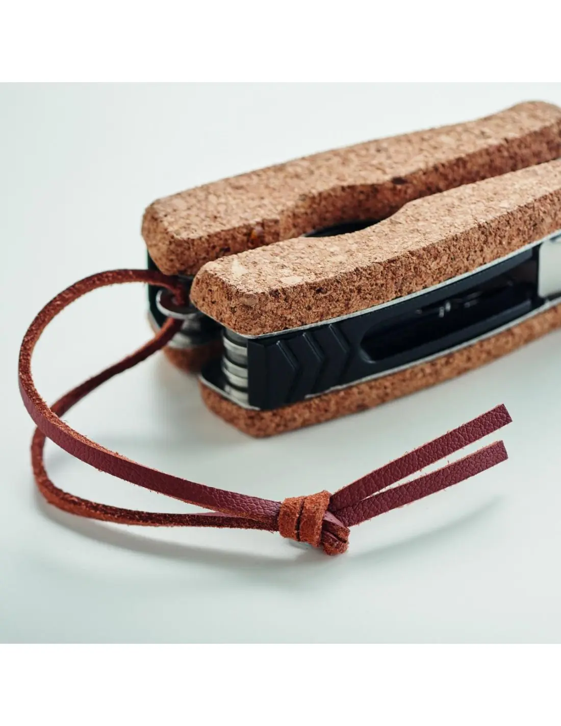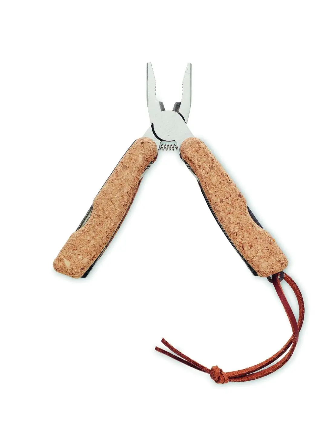 Navaja multifunción de acero inoxidable con funda de corcho y cuerda de PU. 9 funciones. Incluye: Alicates, 2 abridores, destornillador puntas Philips, hojas de sierra, cuchillo, lima y destornillador con punta plana.El corcho es un material natural, debido a su naturaleza estructural y porosidad superficial, el resultado final de la impresión por artículo puede tener desviaciones.