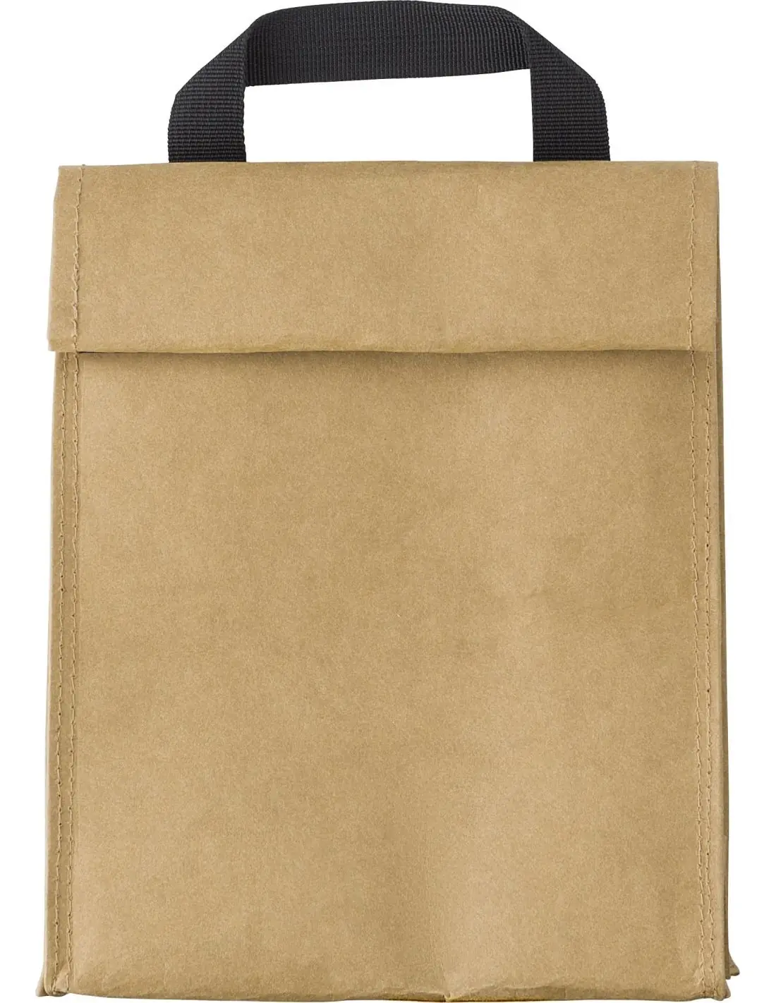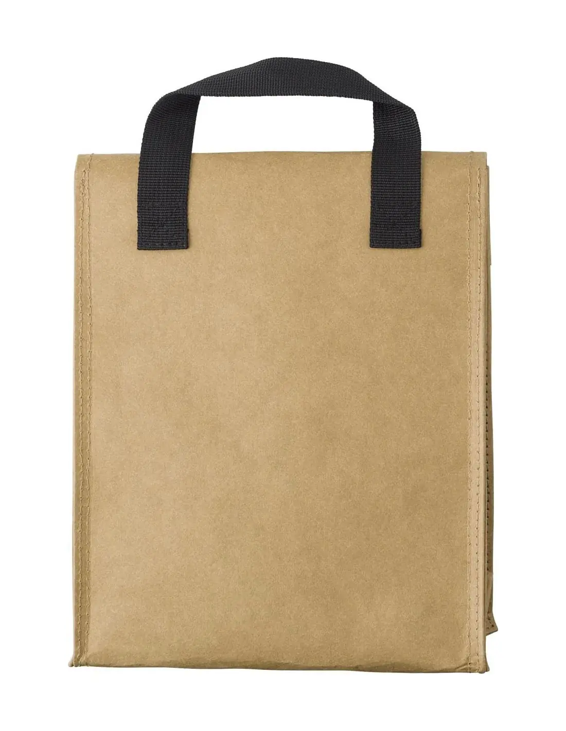 Bolsa isotérmica de papel kraft lavado con revestimiento de PEVA (15C). Asa corta y resistente cierre de velcro.