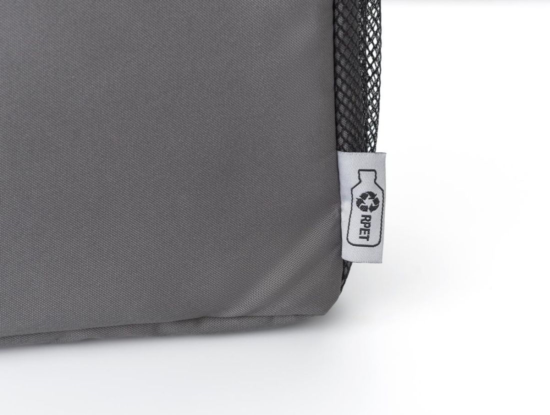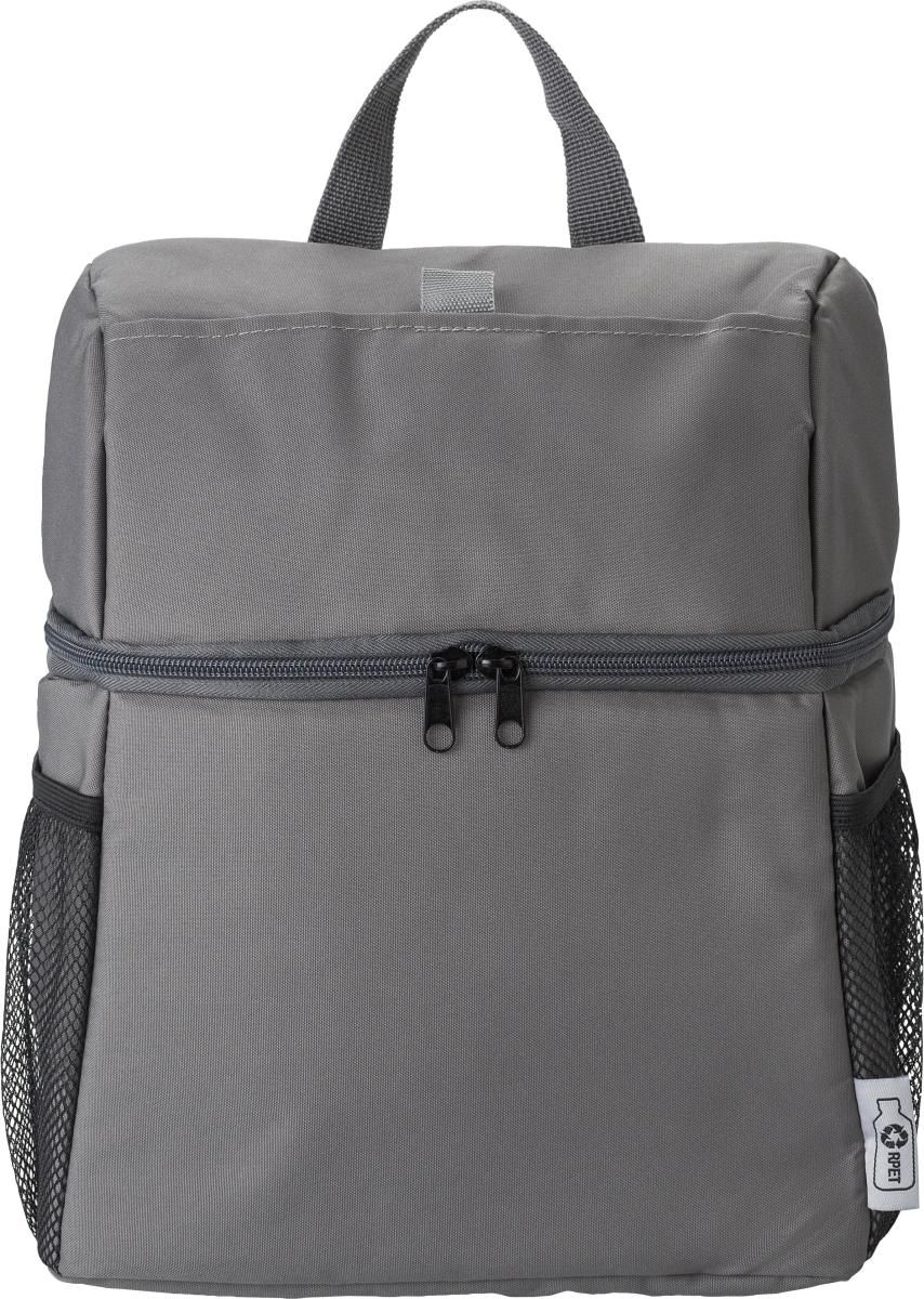 Mochila isotérmica de poliéster reciclado (300D/PU rPET) con forro de PEVA (13C). Bolsillo delantero con cierre de velcro y dos bolsillos laterales de malla. Tirantes ajustables.