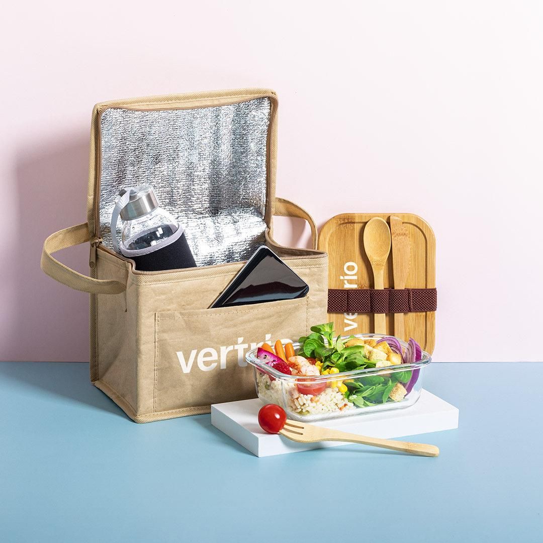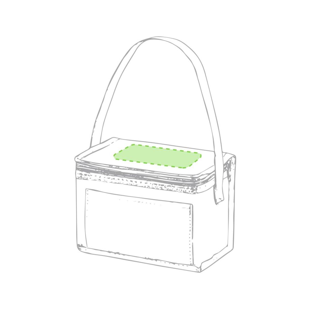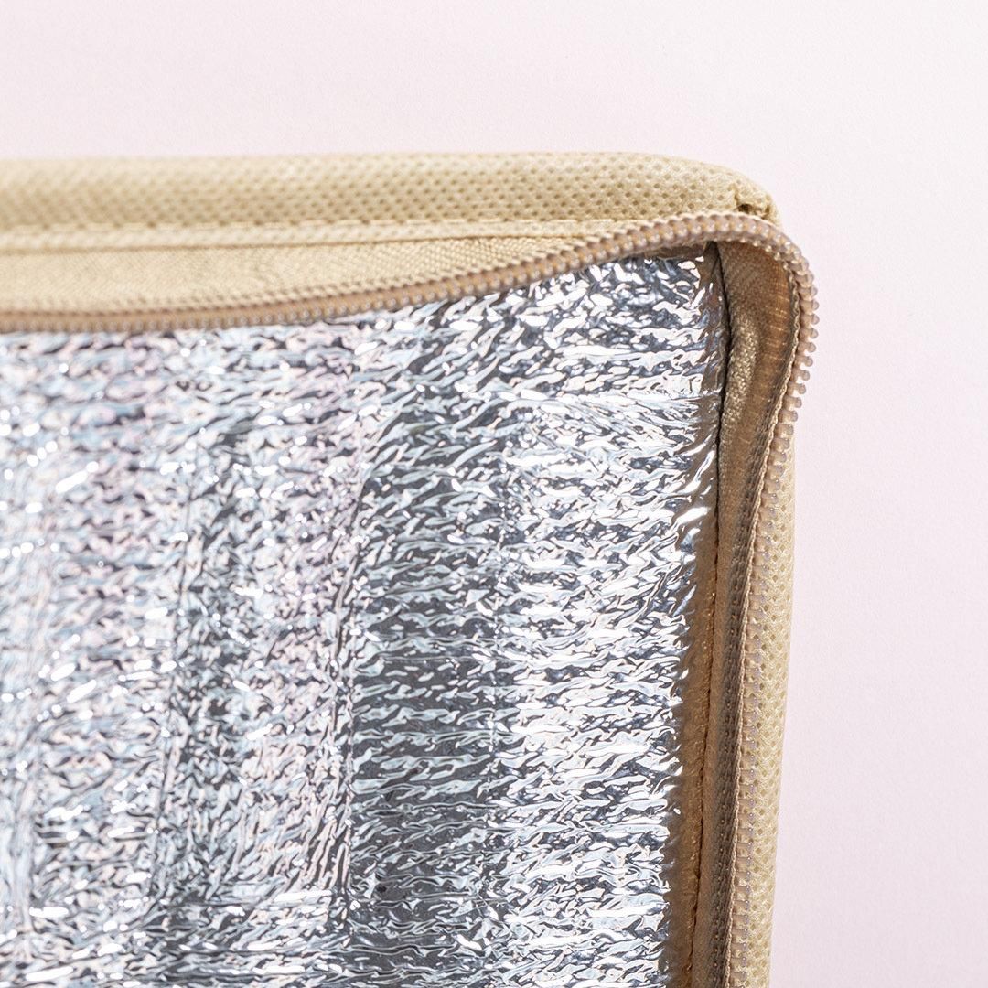 Nevera de línea nature con capacidad para 6 latas. Fabricada en papel laminado resistente a la humedad, con interior isotermo acabado en aluminio. Cremallera y asa de transporte a juego, con bolsillo exterior para marcaje.