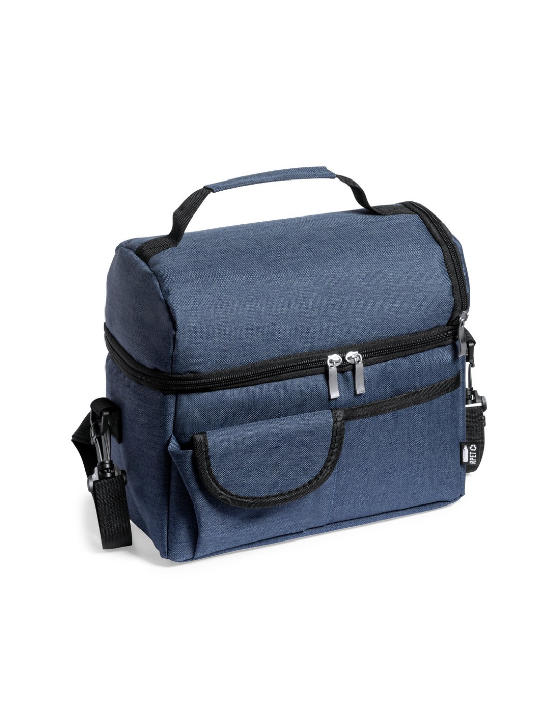Nevera fabricada en resistente 600D RPET. Incluye 2 compartimentos independientes, con cierre de cremallera y tiradores metálicos. Interior isotermo...