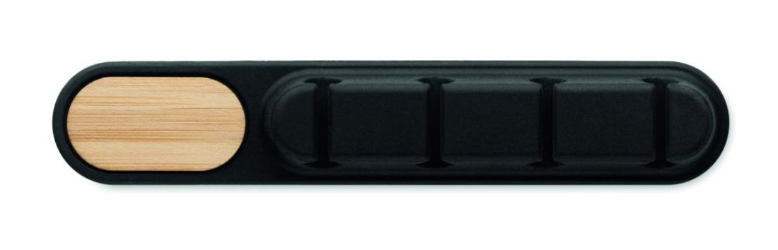 Organizador de cables de silicona con detalle de bambú natural. Su diseño ovalado y compacto mantiene los cables ordenados y seguros.