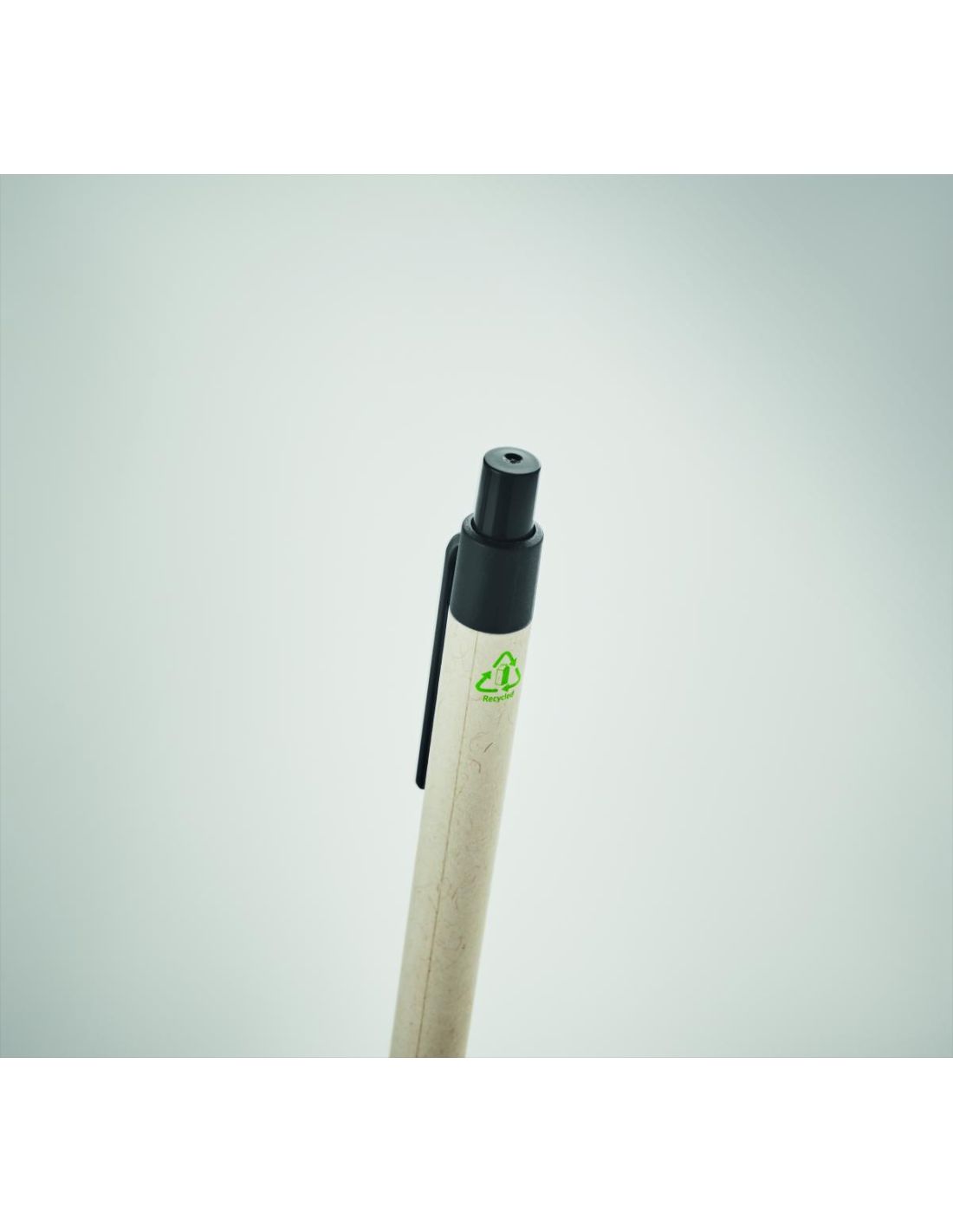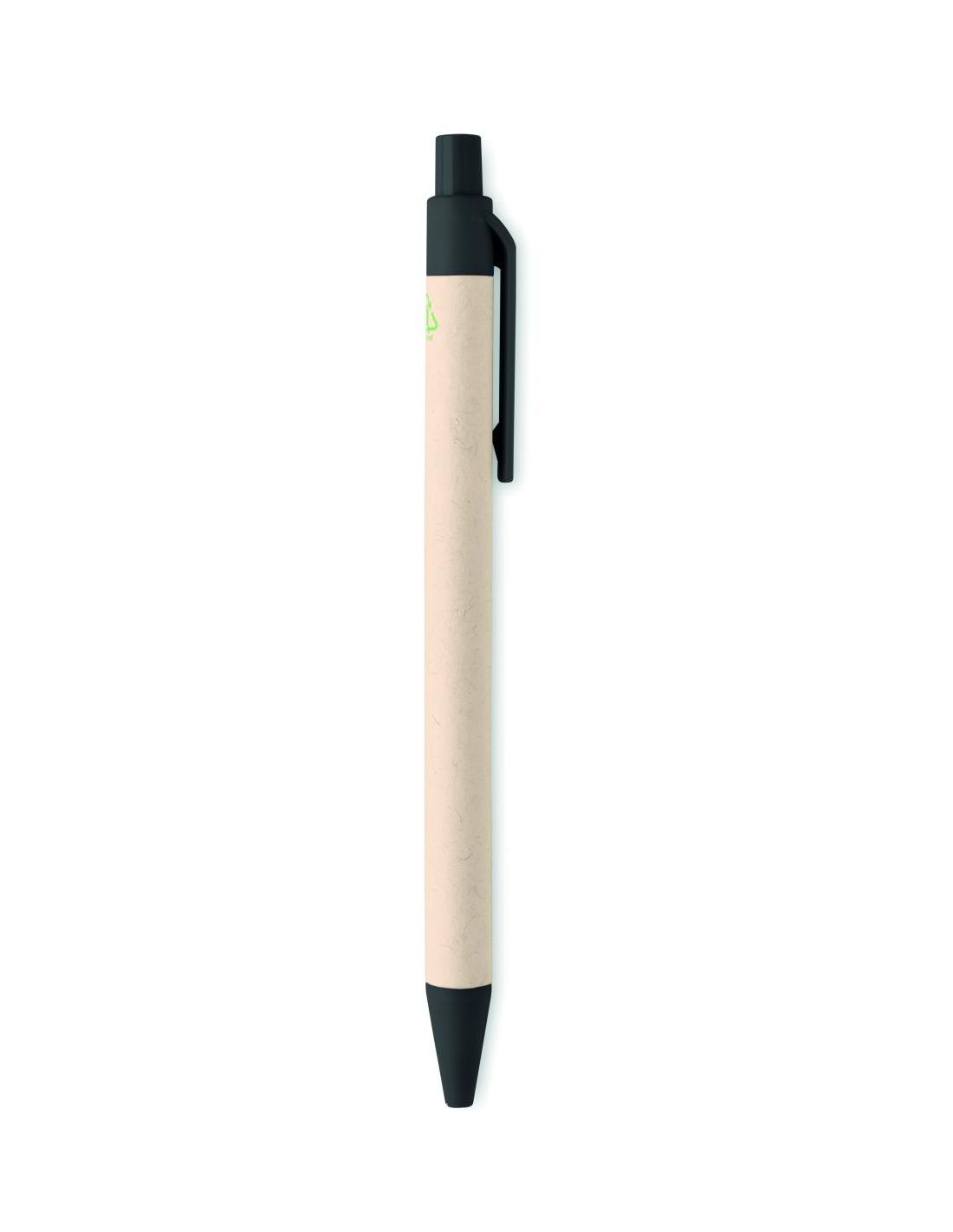 Bolígrafo con pulsador con cuerpo de cartón de leche reciclado y piezas de PLA (en maíz 100% biodegradable). Tinta azul.