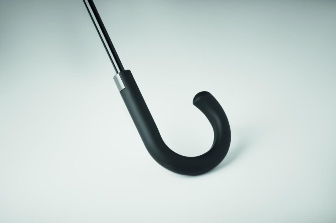 Paraguas de 23'' antiviento y de apertura automática en pongee 190T con diseño interior a cuadros. Estructura de fibra de vidrio con eje chapado en negro y puntas de plástico. Mango curvado acabado en goma. Cierre manual.