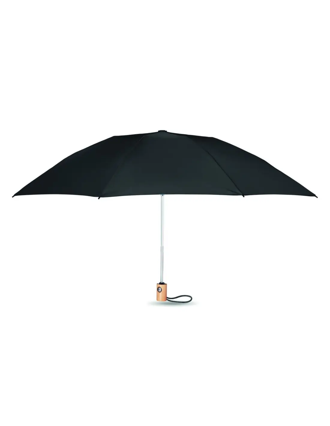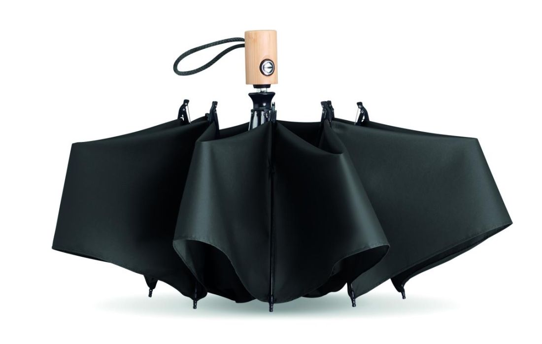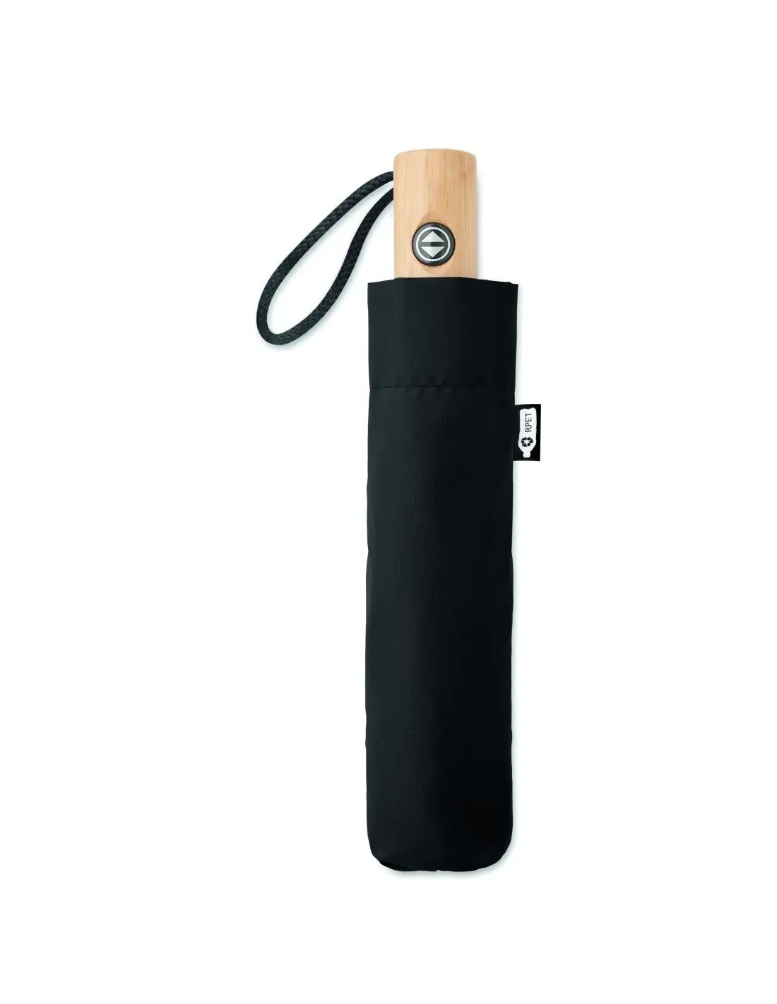 Paraguas de 23'. Apertura/cierre automático en pongee RPET 190T. Costillas de fibra de vidrio. Mango de bambú con correa de algodón para la muñeca. Incluye bolsa de RPET a juego. El bambú es material natural, el color del articulo puede variar.