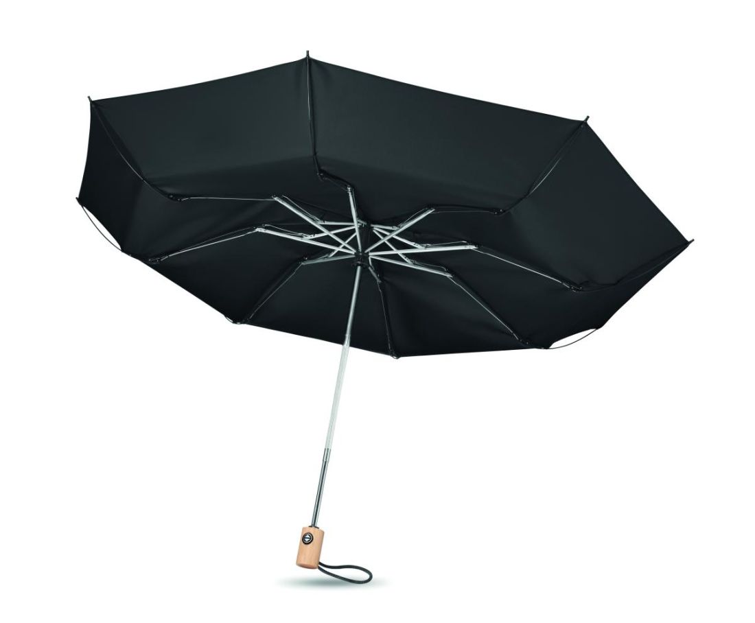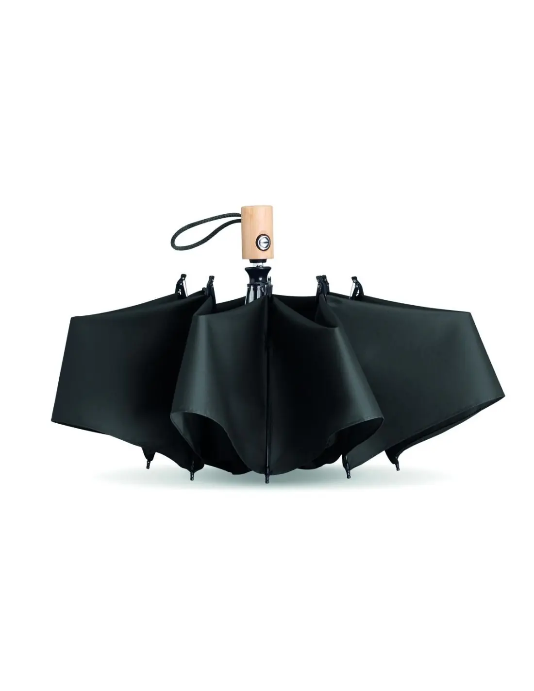 Paraguas de 23'. Apertura/cierre automático en pongee RPET 190T. Costillas de fibra de vidrio. Mango de bambú con correa de algodón para la muñeca.…