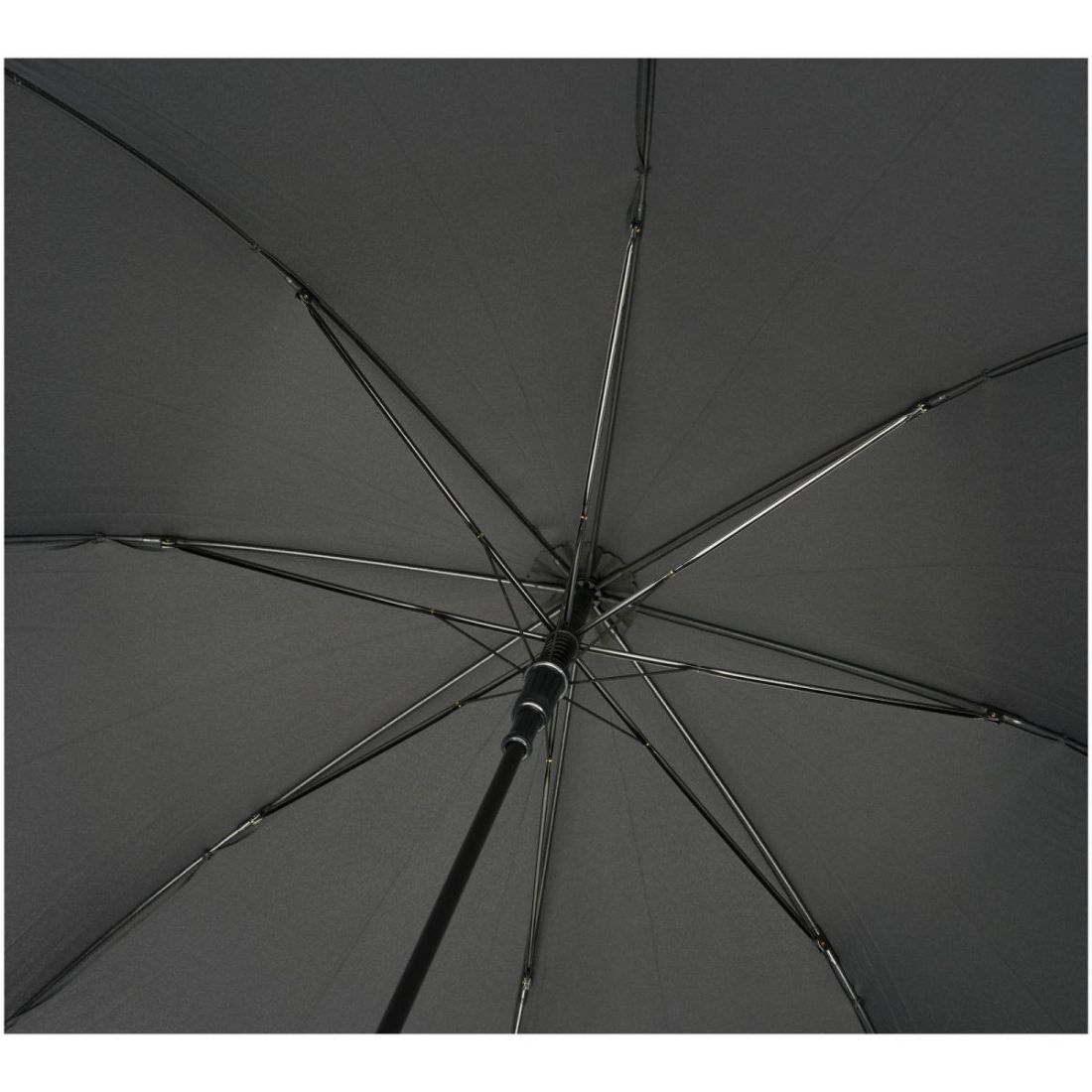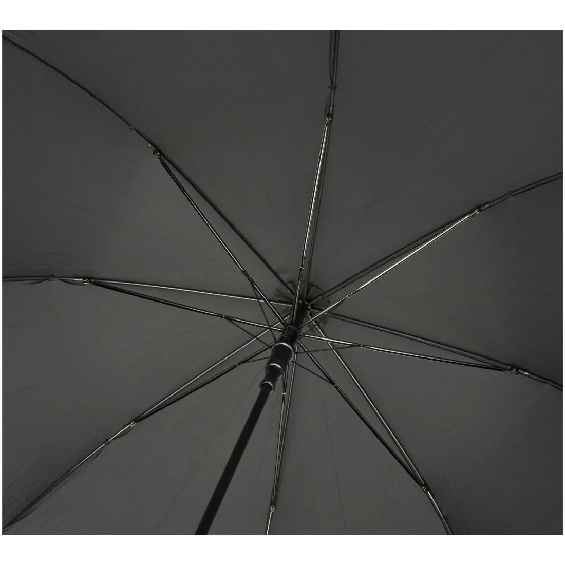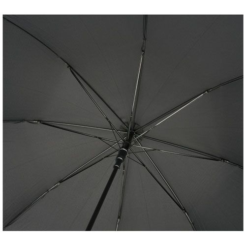 Paraguas de apertura automática con capa externa de poliéster de tafetán de tereftalato de polietileno reciclado. Eje metálico robusto y estructura de alta calidad con varillas de fibra de vidrio que ofrece flexibilidad en condiciones de viento. Se trata de una opción más sostenible gracias al mango de madera, las puntas de las varillas y la capa externa de poliéster de tafetán de tereftalato de polietileno reciclado. Disponible en una amplia variedad de colores contemporáneos con una gran zona de decoración en cada uno de los paneles.