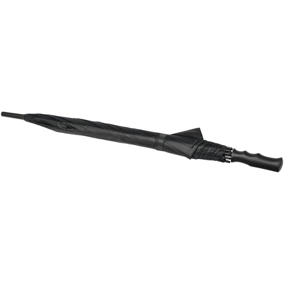 Paraguas de apertura automática con capa exterior de poliéster de tafetán. Tiene un robusto eje metálico y una estructura patentada de fibra de vidrio de alta calidad, que ofrece la máxima flexibilidad en condiciones de viento. Mango de plástico recto, puntas y capa externa en la superior. Disponible en una amplia variedad de colores contemporáneos y con una gran zona de decoración.