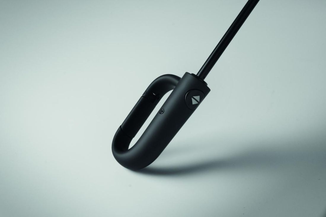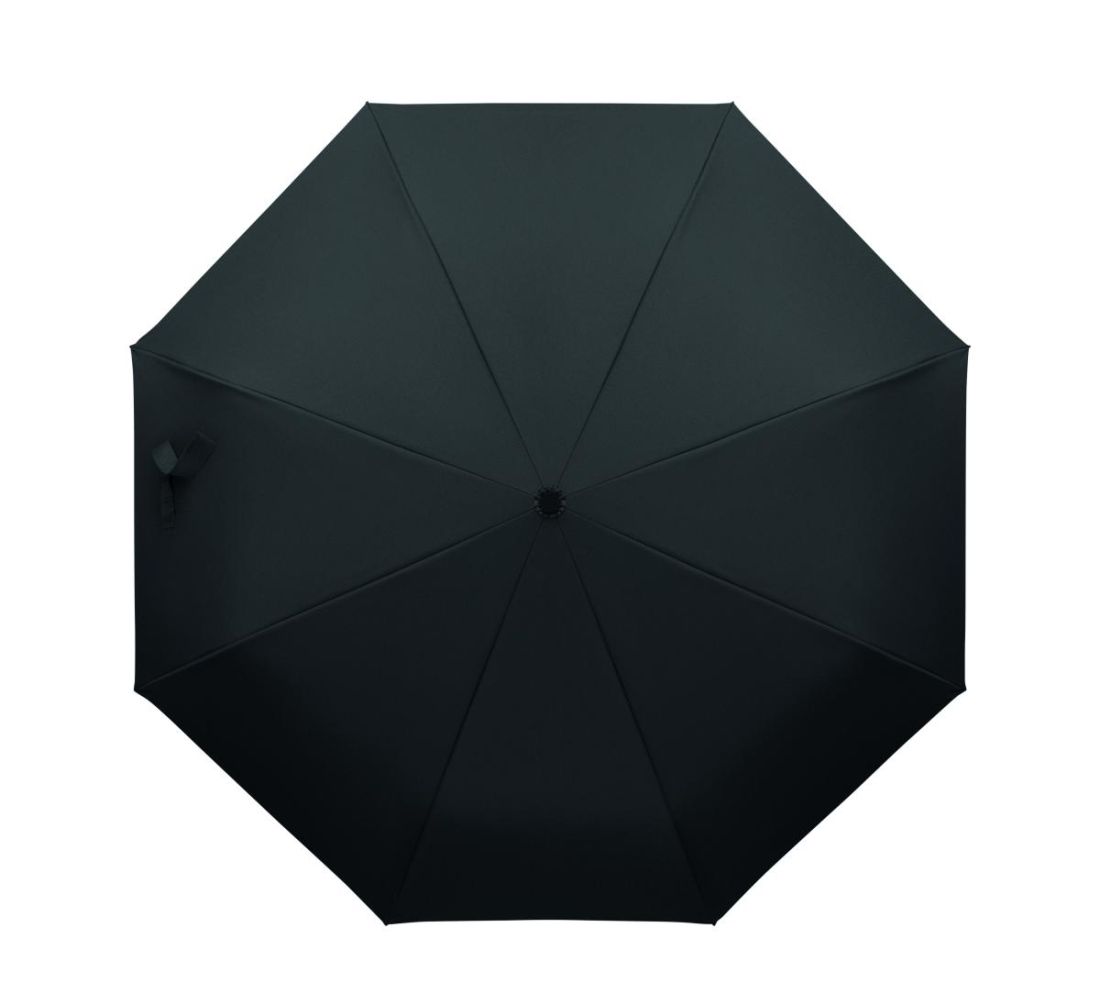 Paraguas antiviento plegable de 21'' con estructura de fibra de vidrio de 2 secciones totalmente chapada en negro. Costillas de fibra de vidrio. Paneles de RPET pongee 190T. Mango de mosquetón con acabado de goma. Apertura y cierre automáticos. Incluye funda