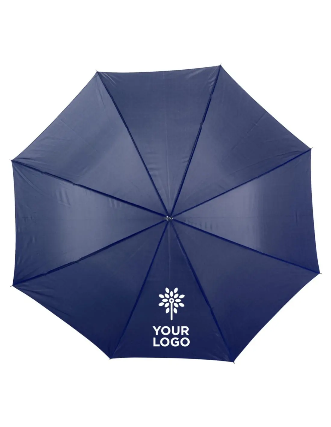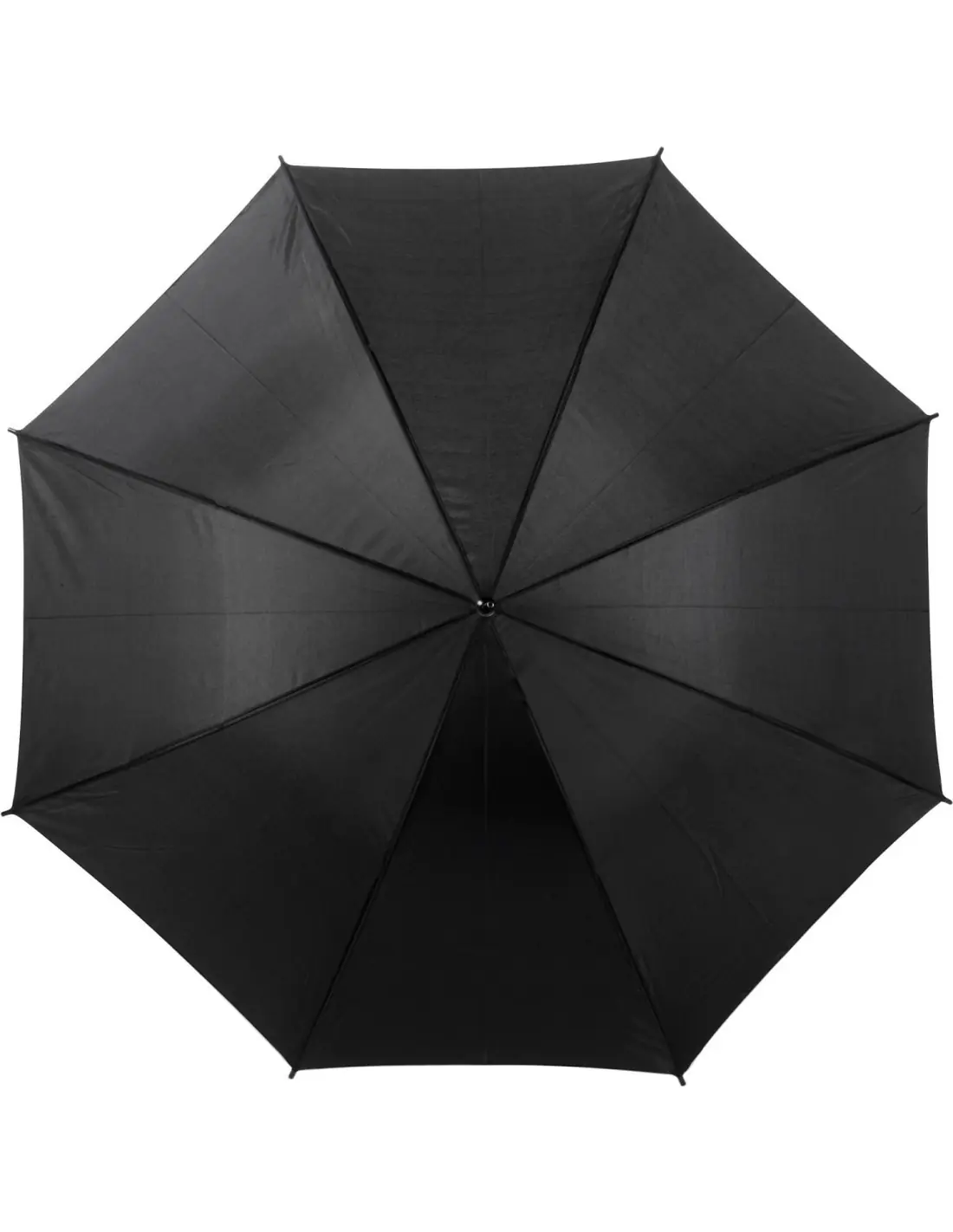 Paraguas automático de 8 paneles de poliéster (190 T). Mango recto de madera pintada, caña y varillas de metal y cierre velcro.