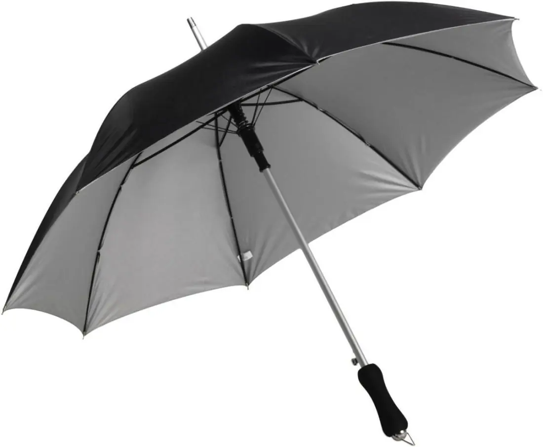 Paraguas automático de 8 paneles de poliéster (210 T), puño recto de EVA, caña y varillas de metal, cierre botón. Exterior del paraguas coloreado, interior en acabado metalizado.