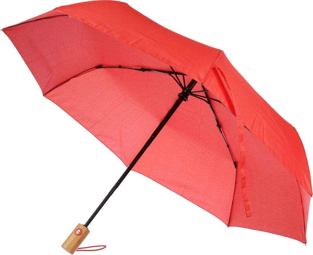 Paraguas automático y plegable con 8 paneles de rPET. Cierre de velcro y mango de bambú. Botón de apertura y cierre. Funda a juego incluida.
