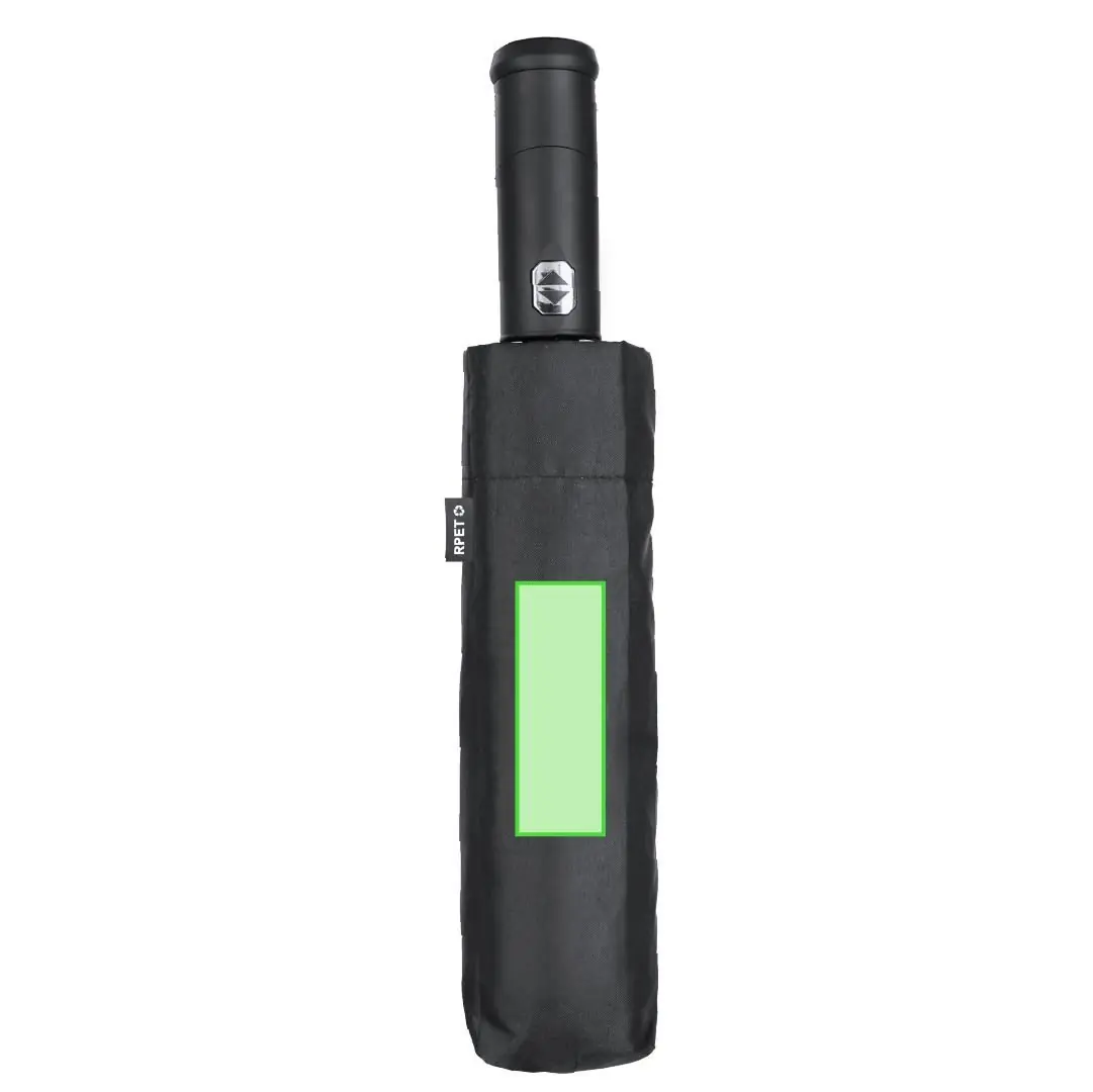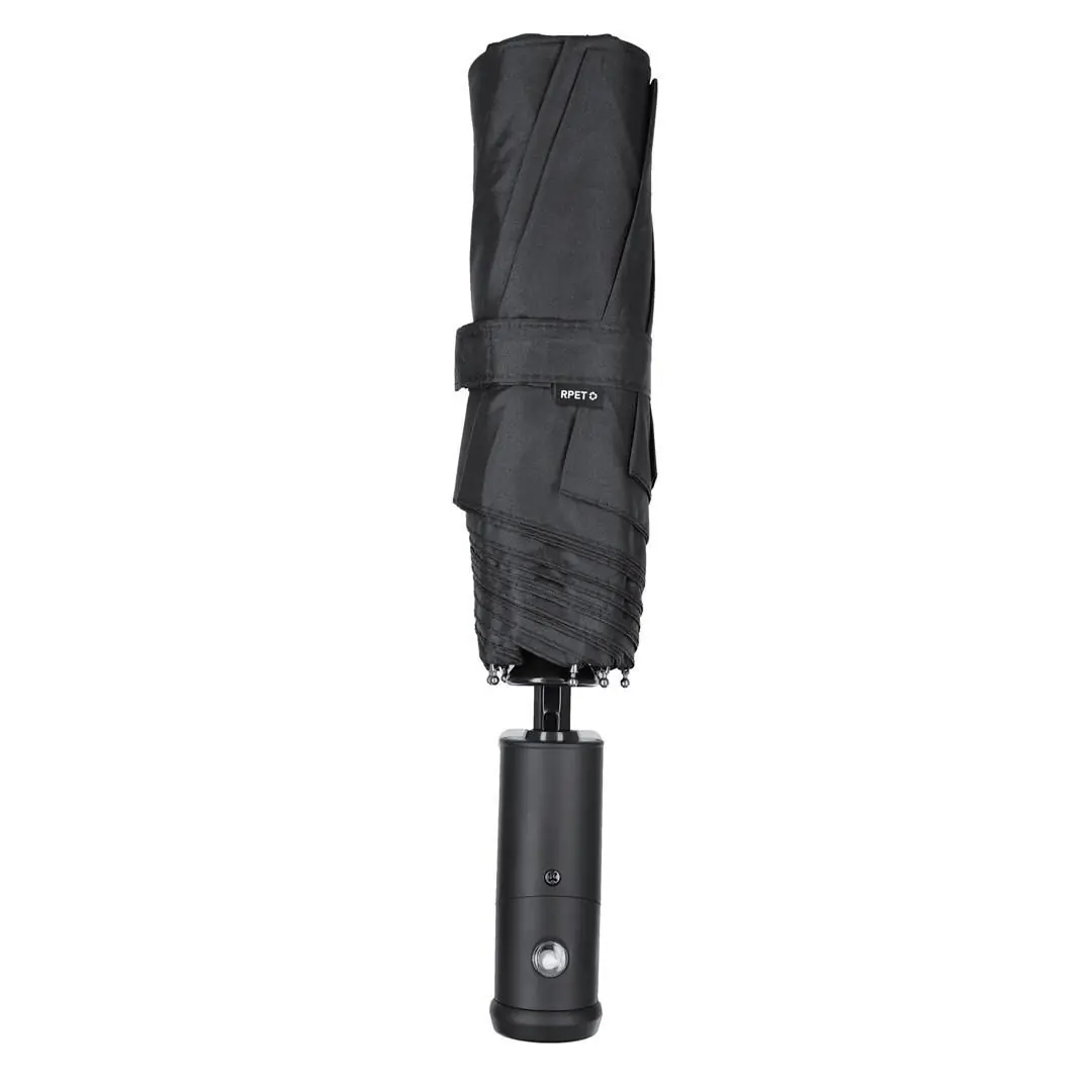 Paraguas fabricado en RPET. Incluye práctico mango linterna con giro de 180º en suave tacto goma y botón ON/OFF. Diámetro de 105 cm en material pongee 190T RPET. De apertura y cierre automáticos, con sistema antiviento y varillas en fibra de vidrio. Incluye distintivo RPET en funda. Alimentación a pilas (de botón incluidas).El material RPET se elabora a partir de plástico reciclado, para así fomentar la reutilización de residuos plásticos y ayudar a la sostenibilidad del planeta.