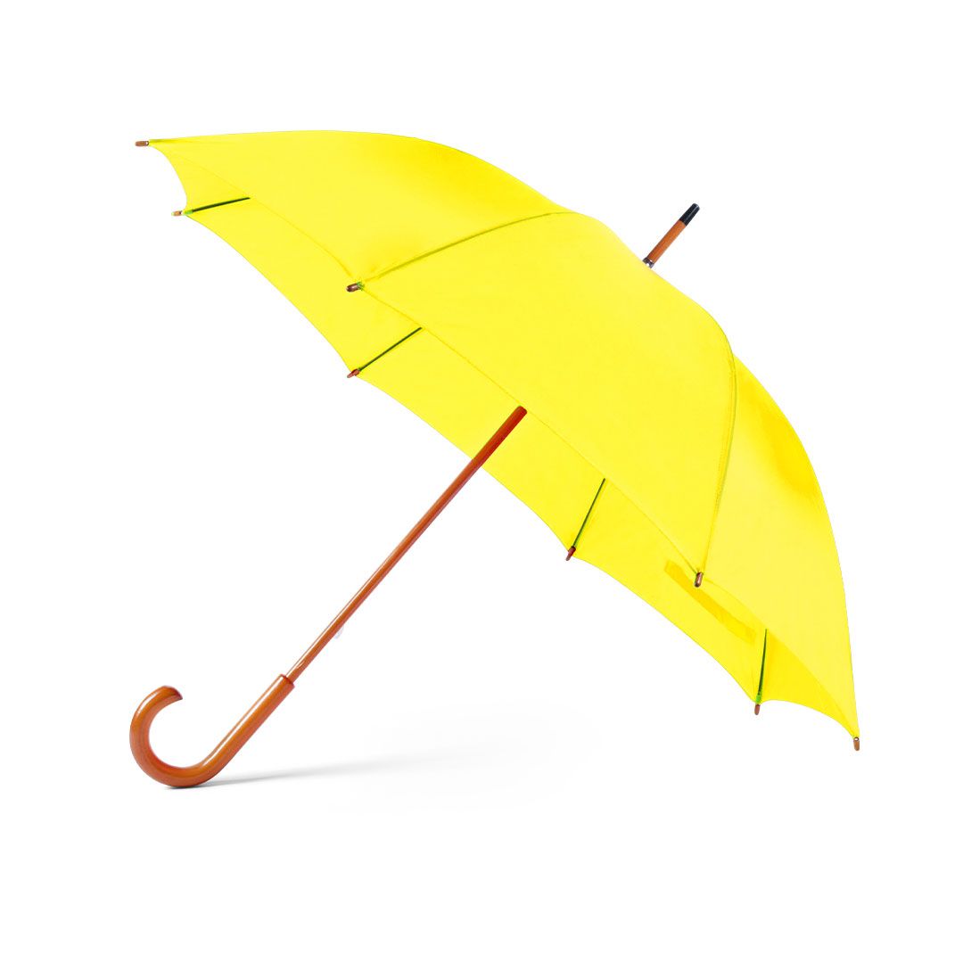 Paraguas de 8 paneles confeccionado en poliéster. De 105cm de diámetro, con apertura manual, varillas metálicas en color negro y cierre de velcro. Palo y mango fabricados en suave madera de color natural, con tela en variada gama de vivos colores.
