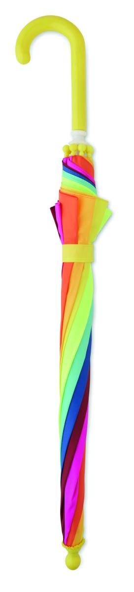 Paraguas infantil de 18'' en pongee 190T con estampado de arco iris. Tiene 8 paneles. Apertura manual y clousre. Costillas y marco de fibra de vidrio. Mango y puntas de plástico. Mango curvado.