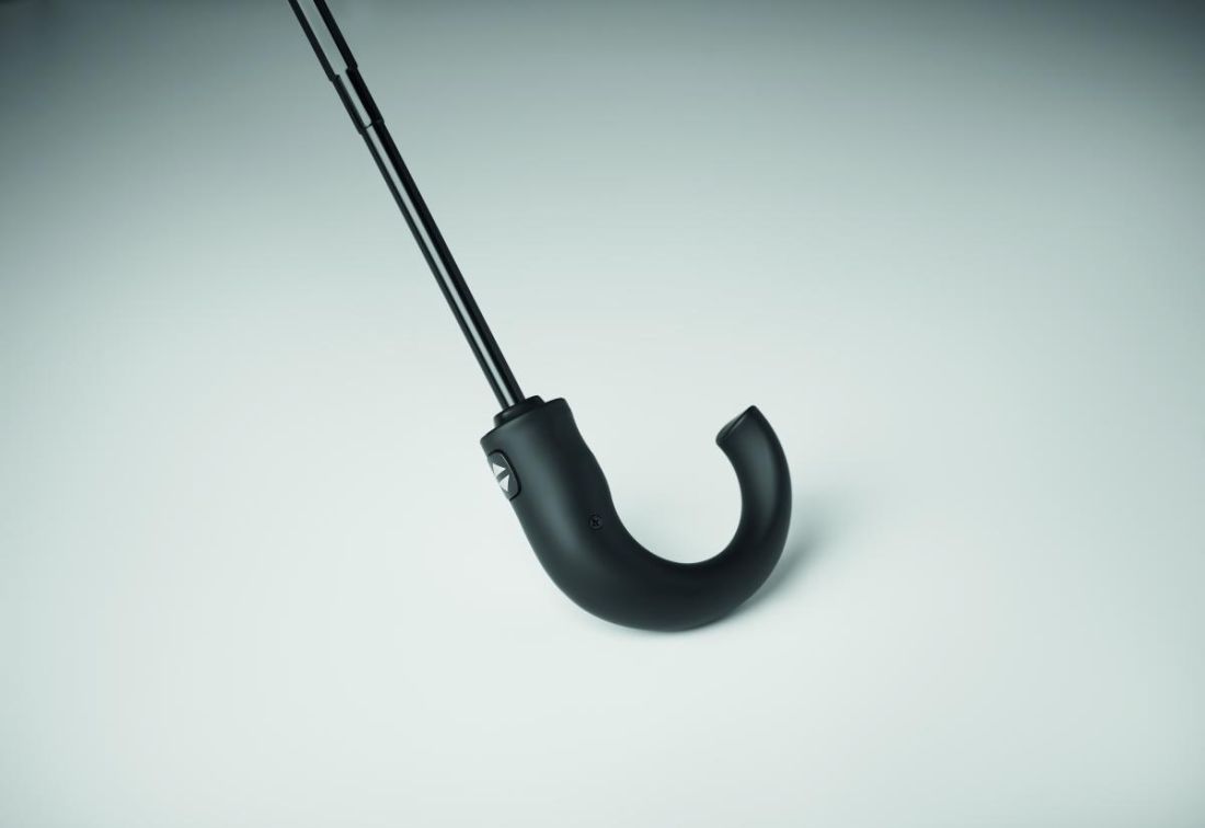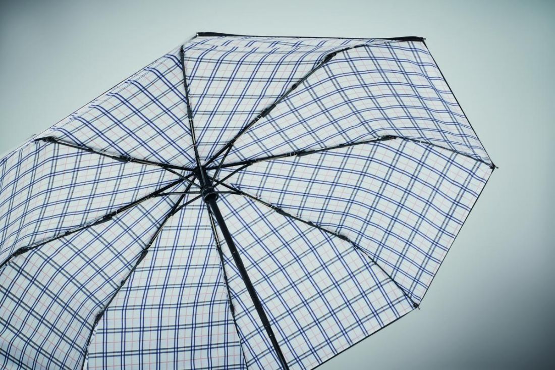 Paraguas de 23'' plegable 3 tiempos, antiviento con apertura y cierre automáticos, en pongee 190T de doble capa con diseño interior a cuadros. Estructura y eje chapados en negro. Parte central de dos secciones de fibra de vidrio negra niquelada. Mango curvado de madera.