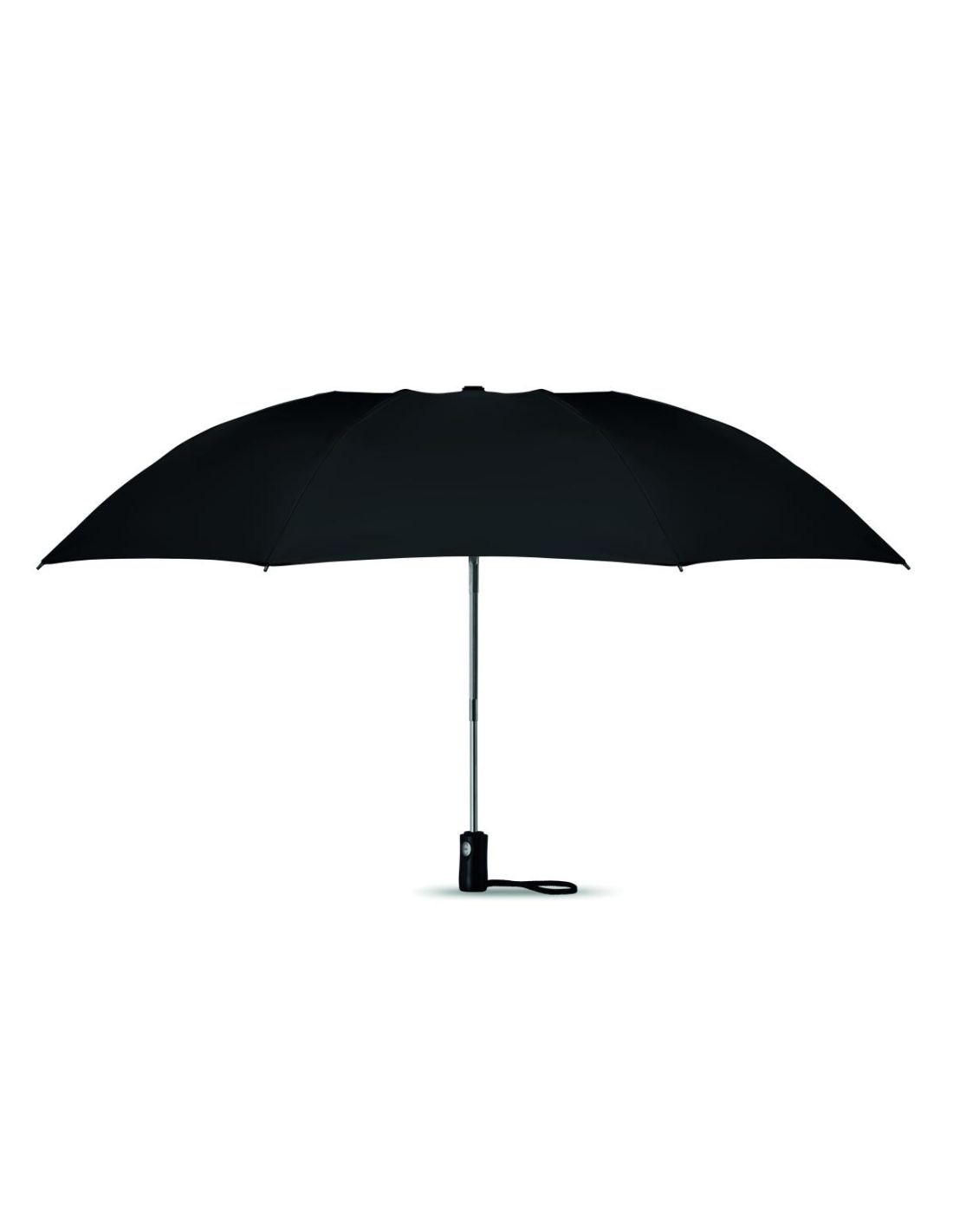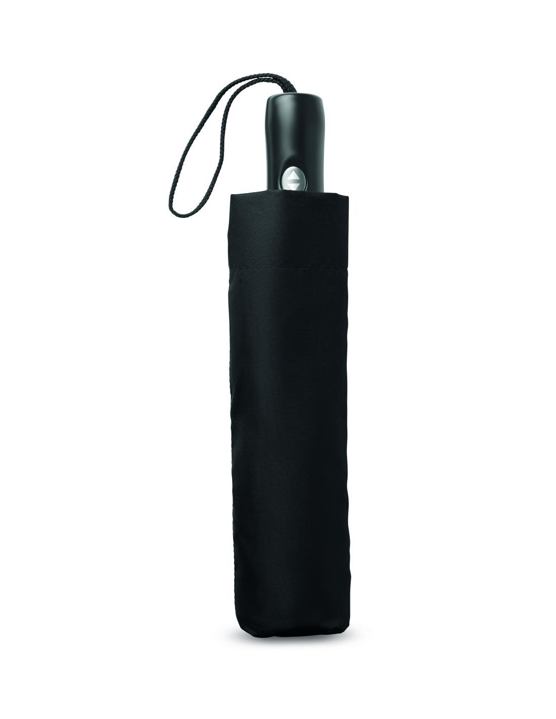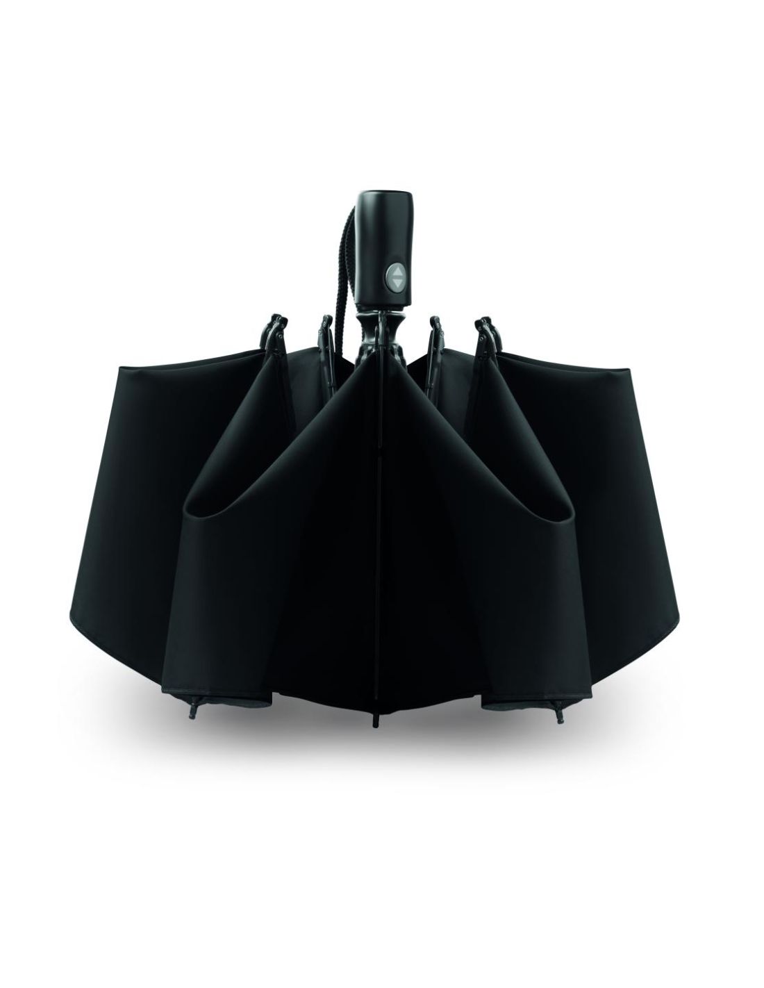 Paraguas plegable de 23'' apertura y cierre automático y reversible en 190T en pongee eje cromado chapado. Costillas en fibra de vidrio de costilla y 1 parte negro chapado en el interior del marco. Mango de ABS negro con pulsador. Incluye funda a juego.