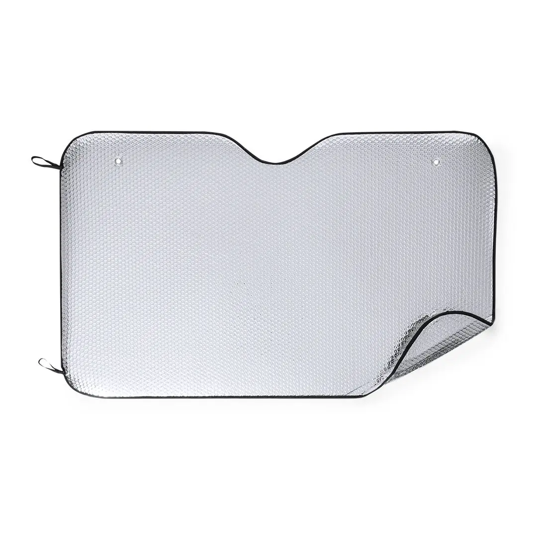 Parasol en aluminio con burbuja en ambas caras en color plateado de acabado metalizado con ribetes en color negro. De tamaño 130x80cm, con argollas metálicas de refuerzo, cintas elásticas para plegado, dos ventosas para ajuste en luna y presentación desplegado en plancha para fácil impresión.