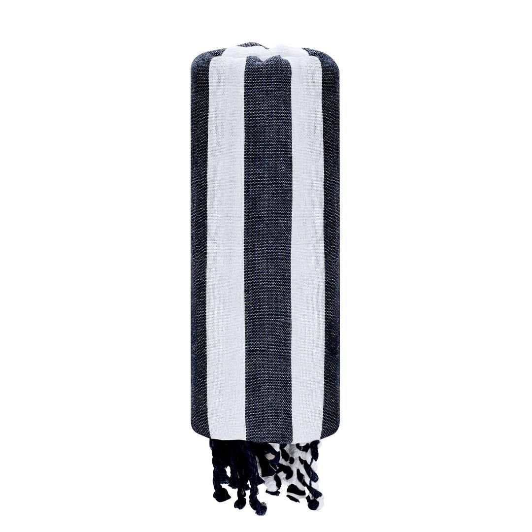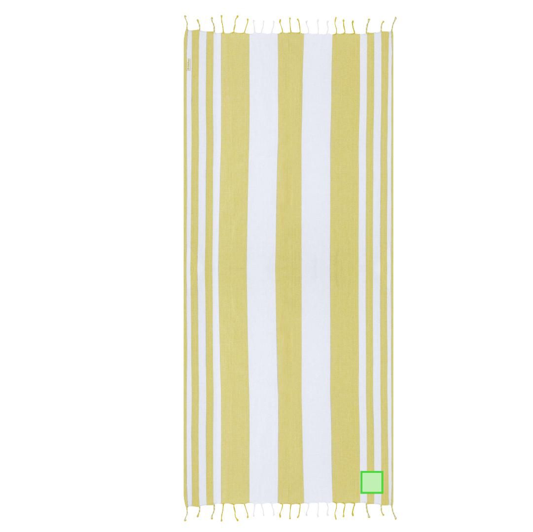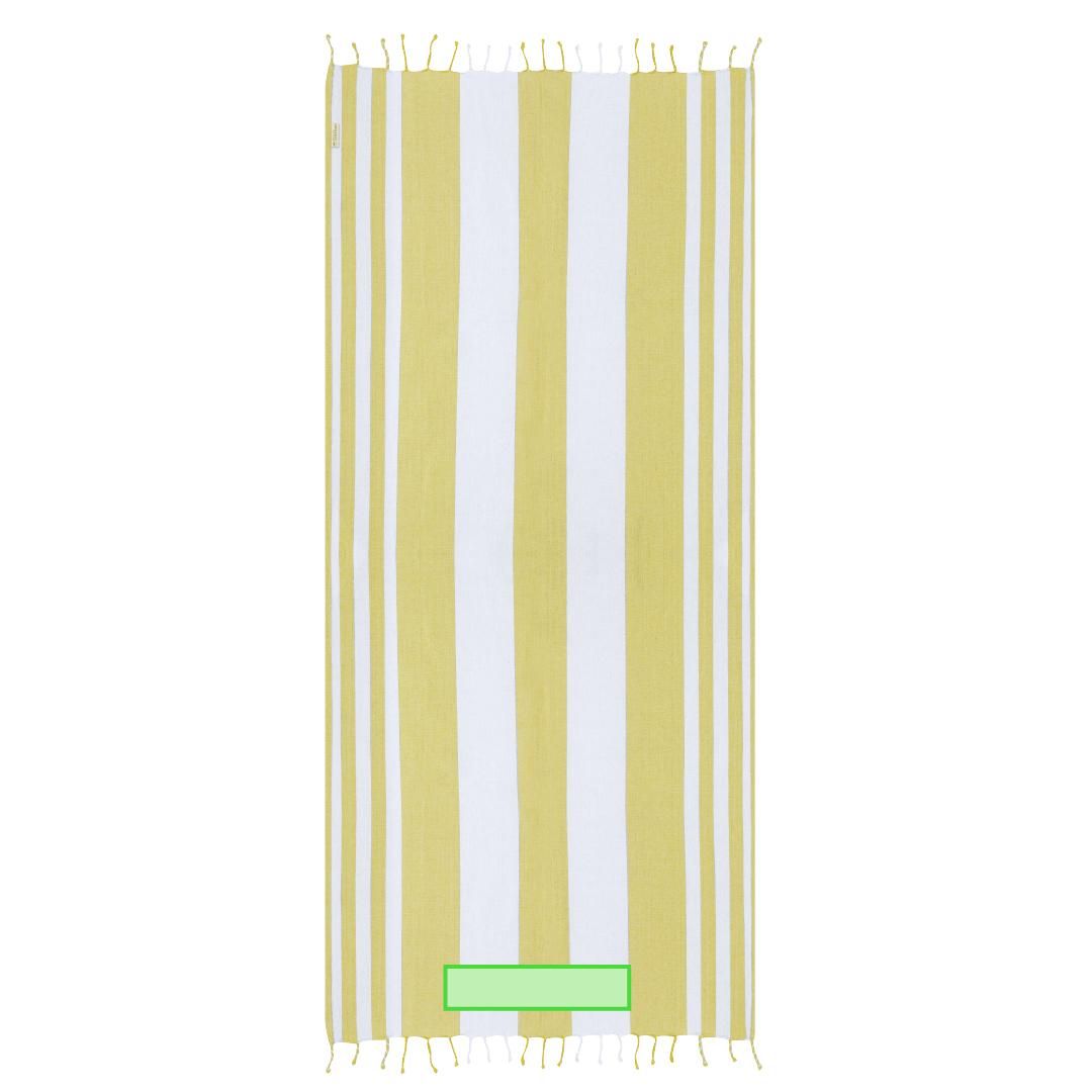 Suave pareo-toalla de 180g/m2 en combinación de Algodón Reciclado y Poliéster RPET. Su diseño cuenta con una base en color y rayas blancas. Incluye flecos en los extremos que añaden un detalle decorativo y que completan su acabado.