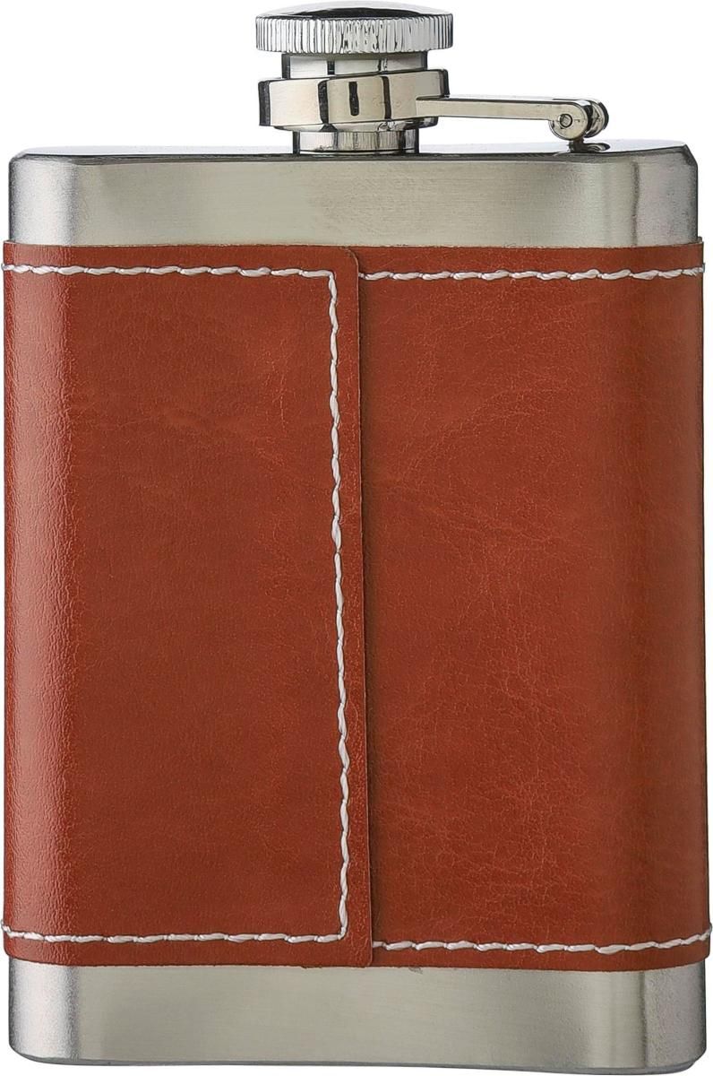 Petaca de acero inoxidable 304 (100 ml) con funda de PU. Presentada en una caja de cartón marrón.