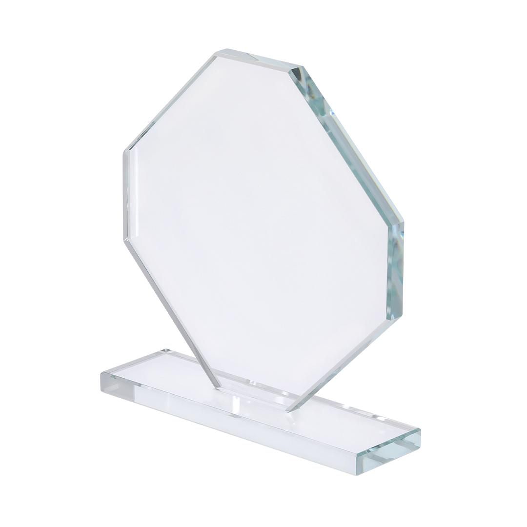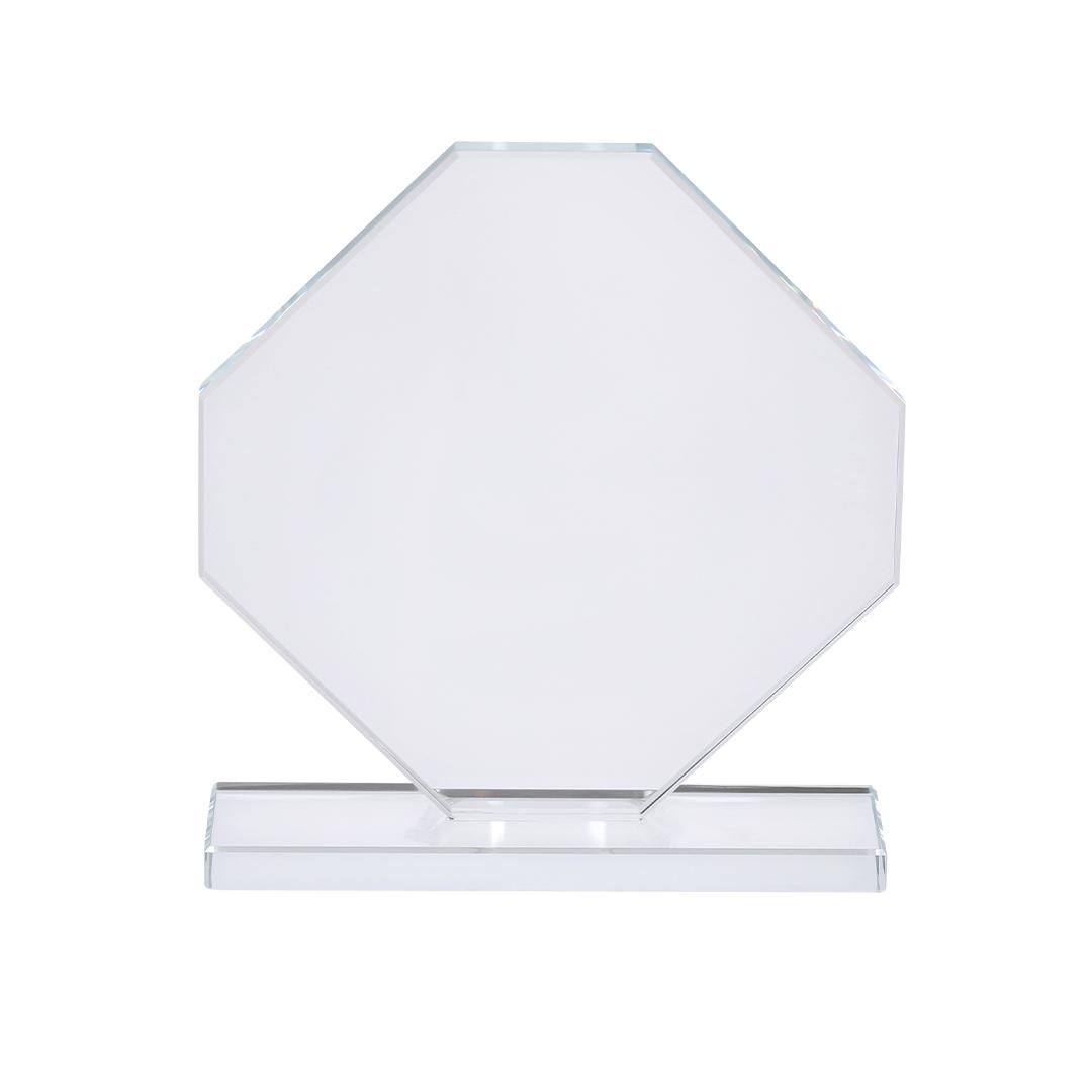 Placa trofeo de grueso cristal con elegante diseño octogonal con soporte. Ideal para regalos personalizados, reconocimientos, premios y decoración.Presentada en estuche de protección individual en elegante diseño.