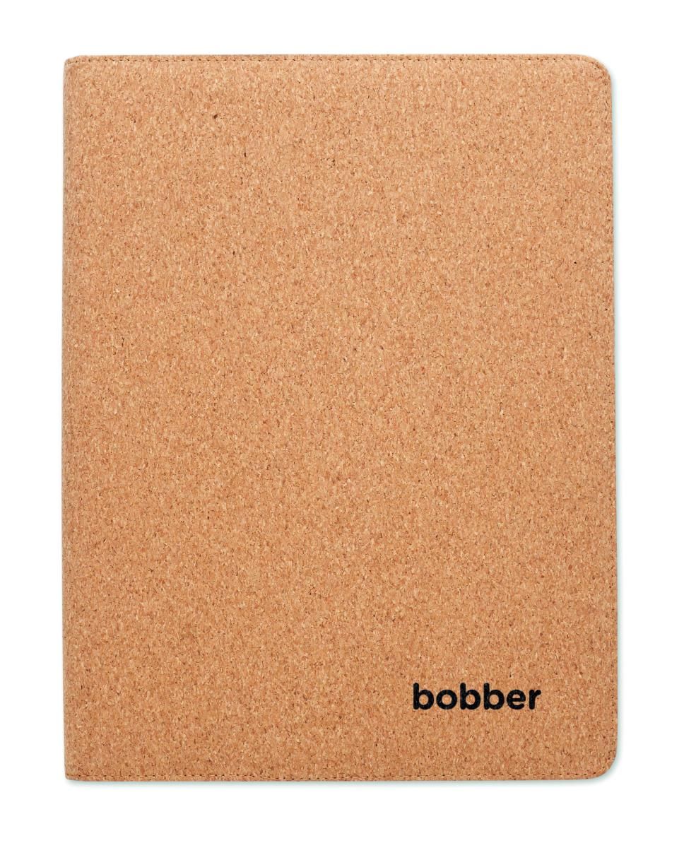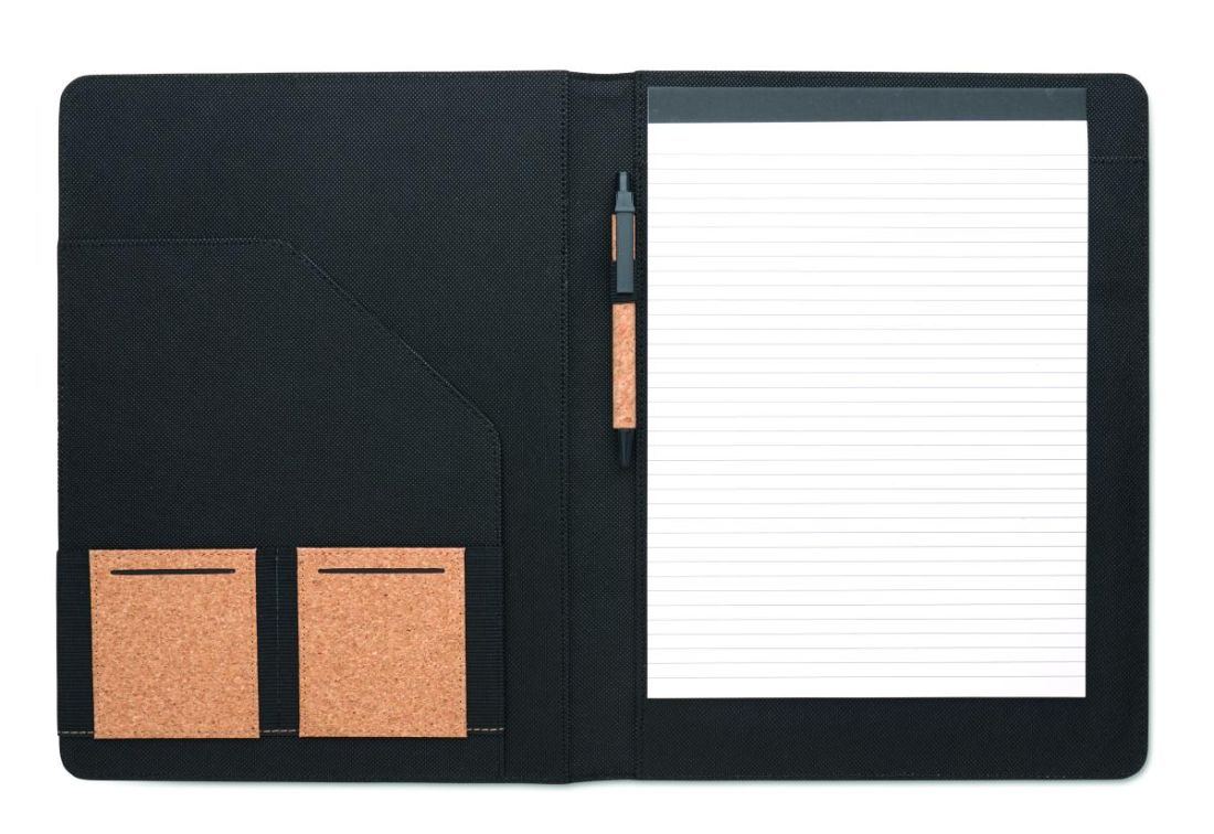 Porta doucmentos A4 de corcho. Bloc de notas A4. 30 hojas rayadas de papel reciclado. Bolígrafo y portabolígrafos a juego. 2 compartimiento para tarjetas y un compartimento grande.