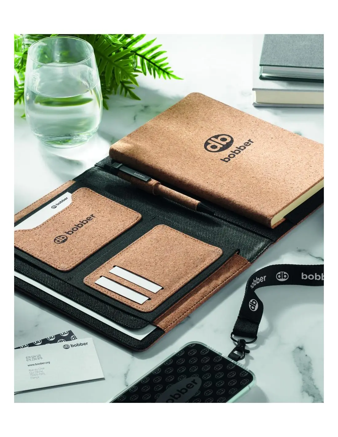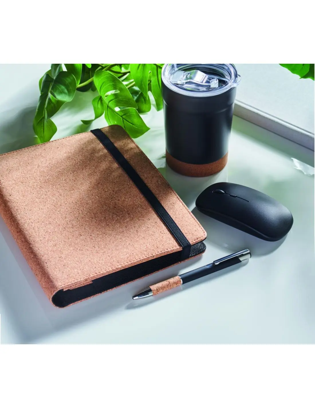 Porta documentos de corcho A5. Incluye libreta A5 con tapa dura de corcho. 192 páginas rayadas de papel reciclado (96 hojas). Bolígrafo y portabolígrafos a juego. 2 tarjeteros y un compartimento grande. Banda elástica de cierre.