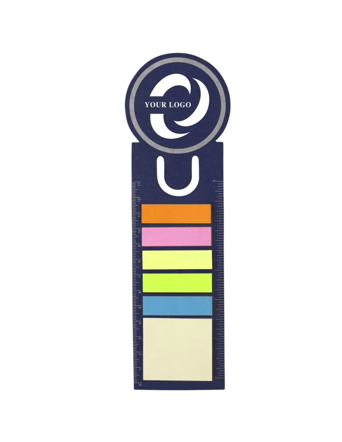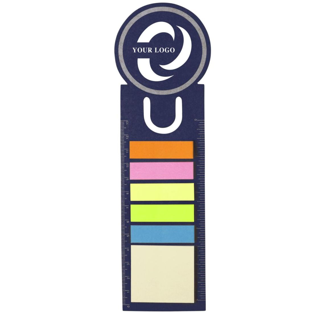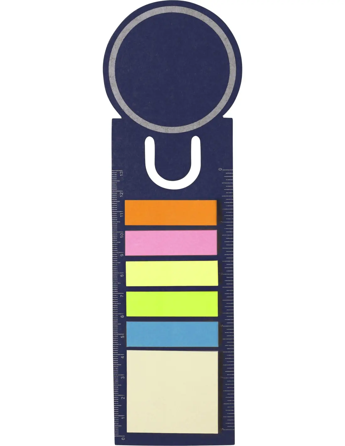 Marcapáginas de cartón con forma redondeada en el extremo superior. Con regla en ambos lados, 5 tiras adhesivas en varios colores y memo de 4 x 4,5 cm.