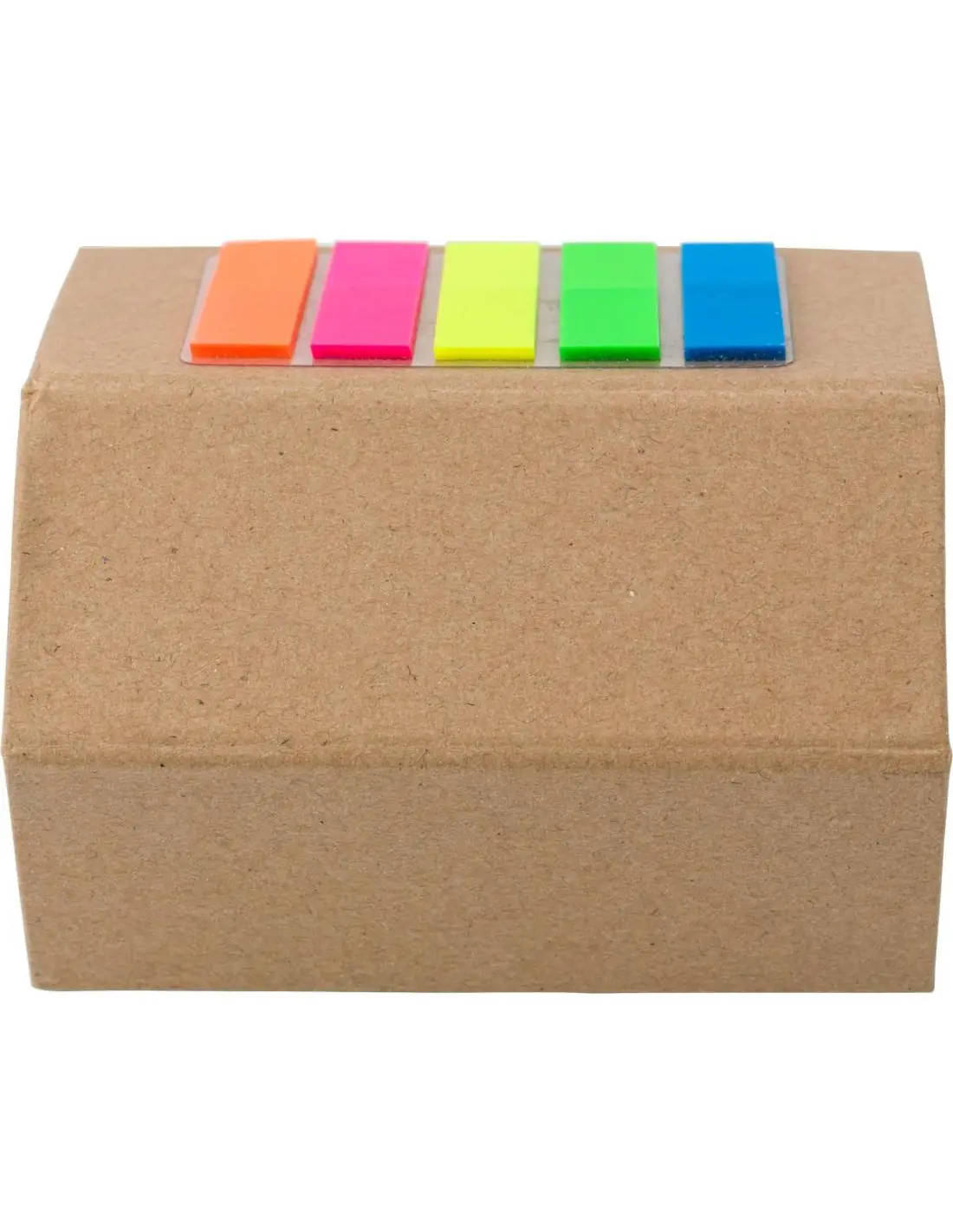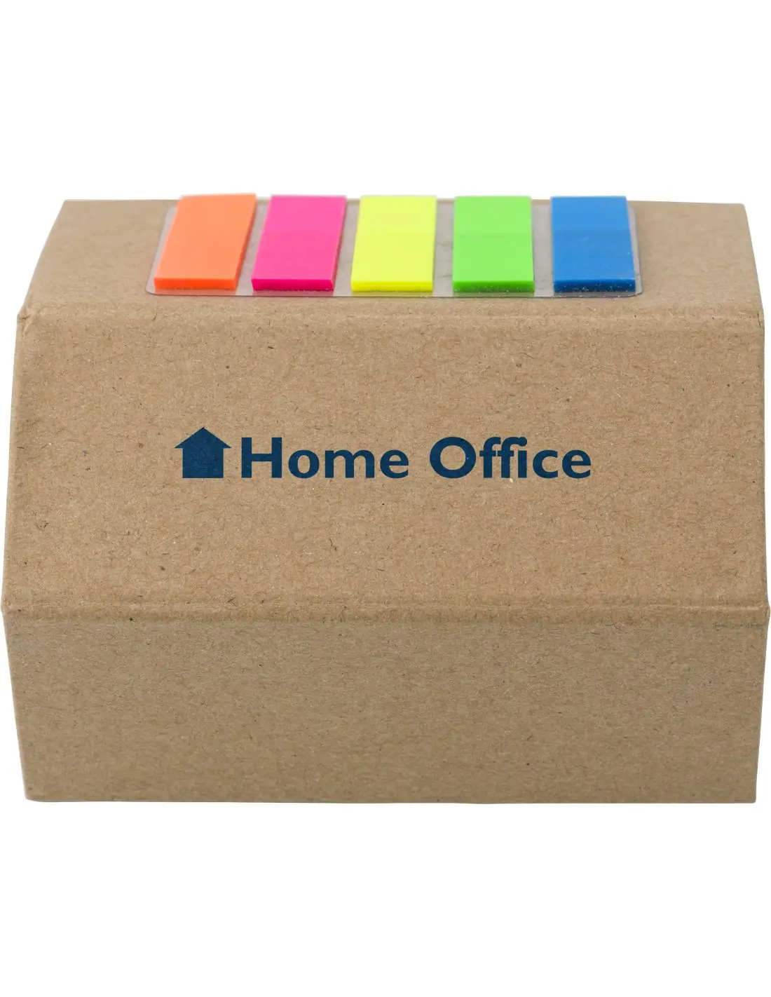 Porta memos en cartón con forma de casa, 125 memos distintos de colores y taco de 400 hojas blancas.