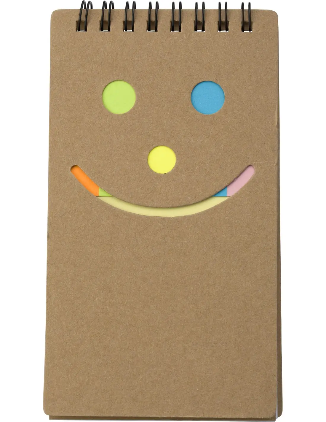 Bloc de notas de cartón con espiral. Tiene 150 tiras adhesivas en diferentes colores y 50 hojas lineadas.