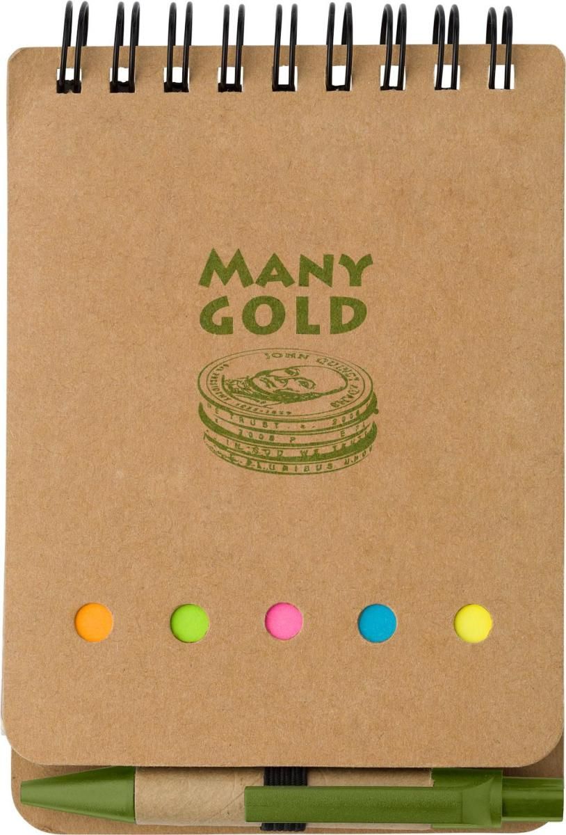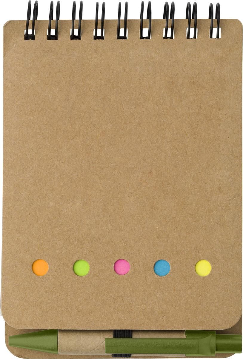 Bloc de notas de cartón con espiral. Tiene 150 memos adhesivos, 60 hojas lineadas y bolígrafo de tinta negra.