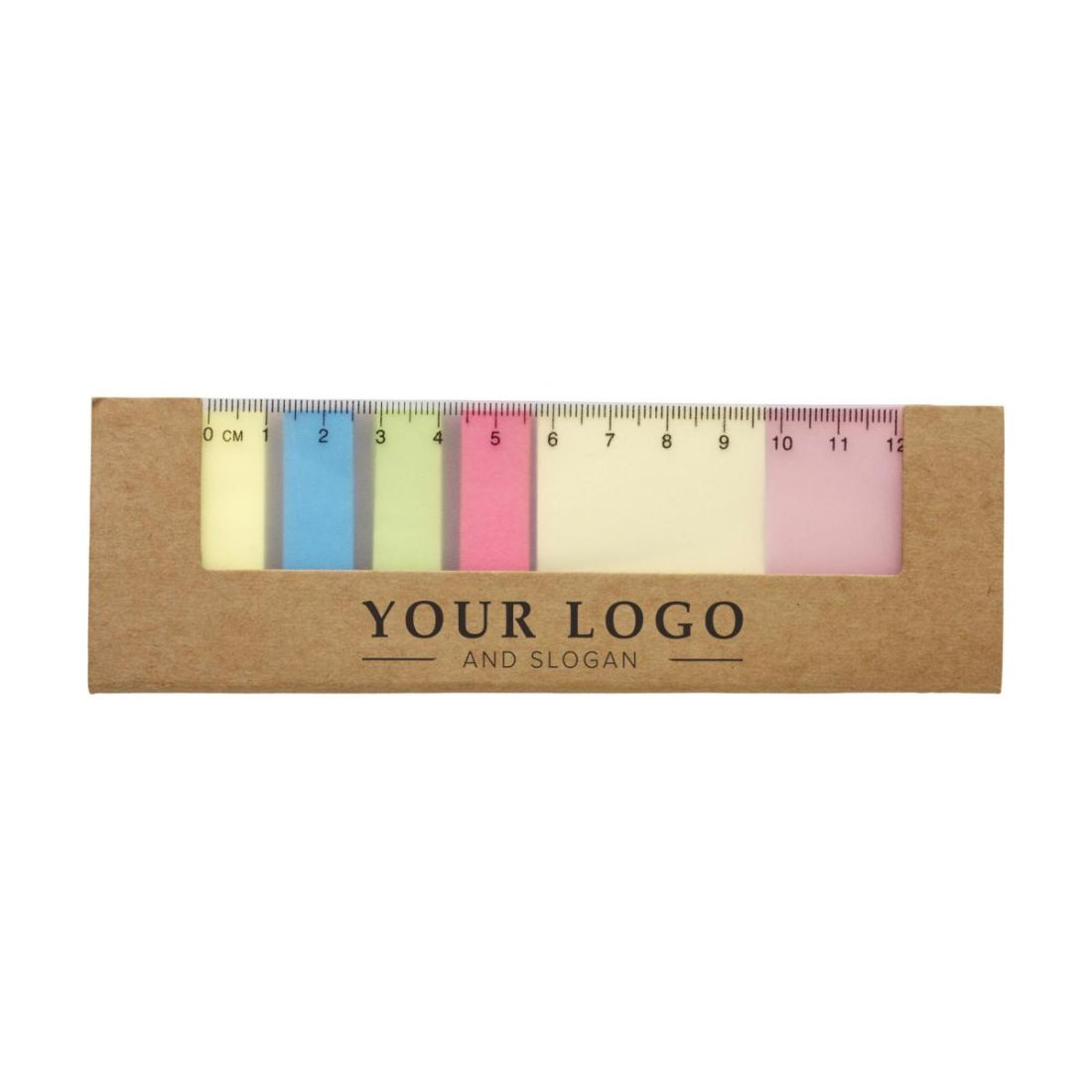 Porta memos de cartón con regla de 12 cm. Incluye 125 tiras y 50 memos, ambos con banda adhesiva.