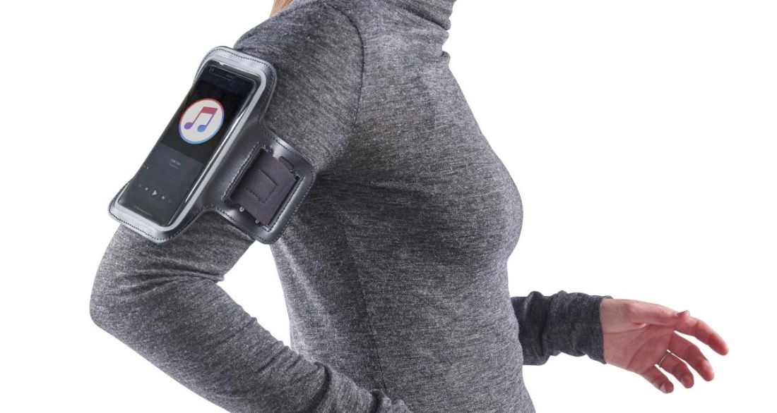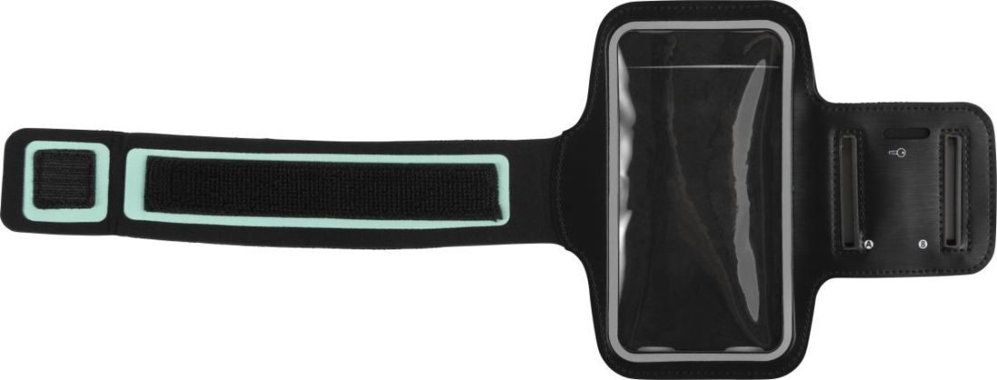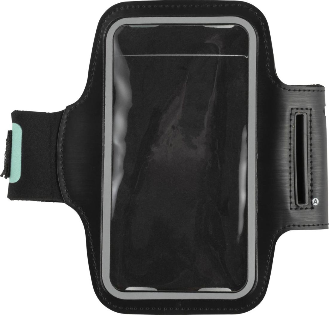 Brazalete portamóvil de EVA con cierre de velcro. Los detalles plateados son reflectantes.