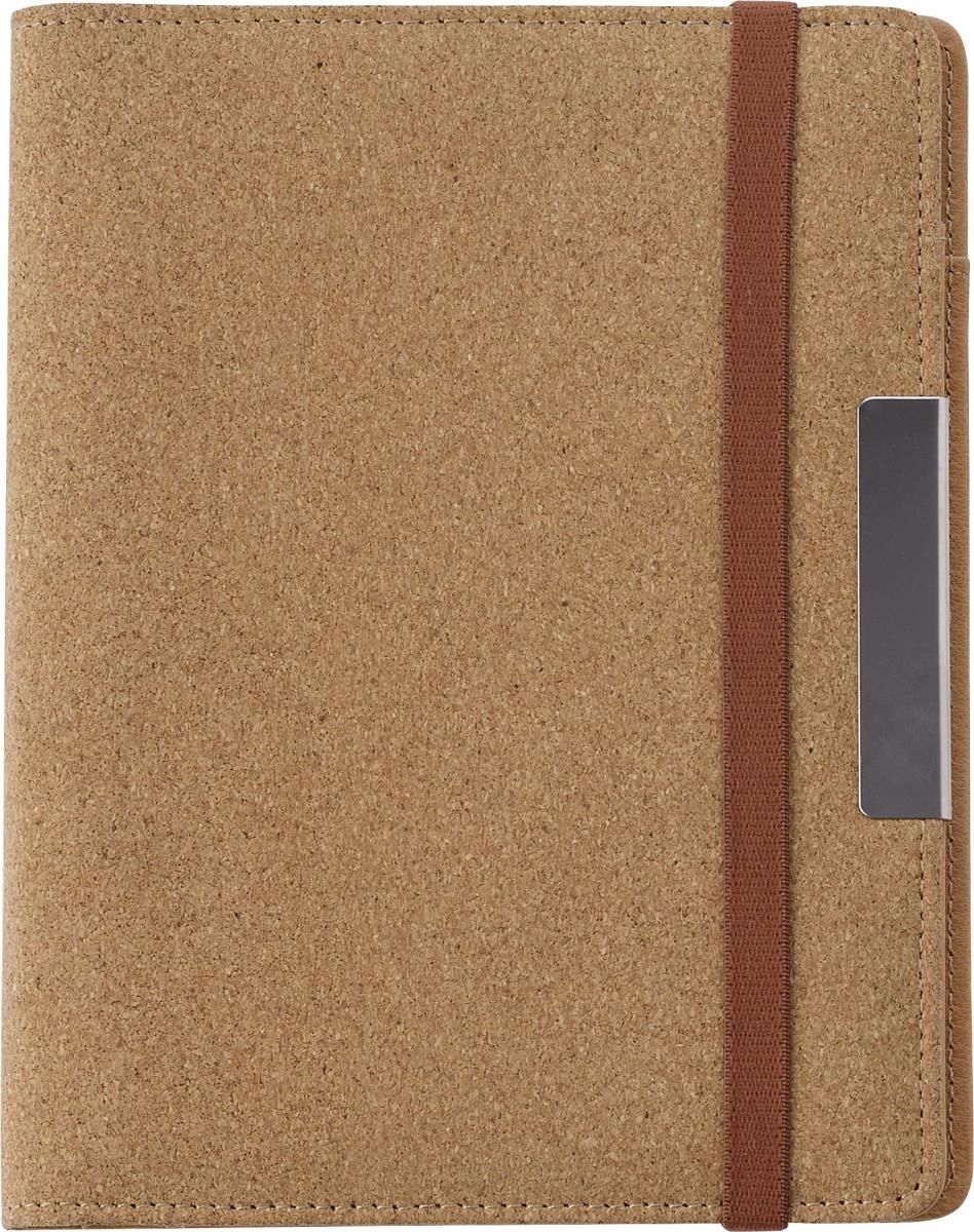 CarPETa de corcho (aprox. A5), con banda elástica como cierre. Interior en PU con pequeño bolsillo de malla como tarjetero, bolsillo grande, bloc de 20 hojas lineadas y porta bolígrafos elástico (no incluye bolígrafo).