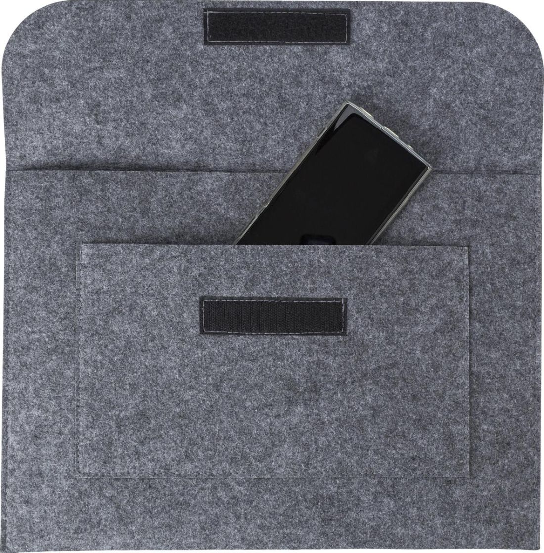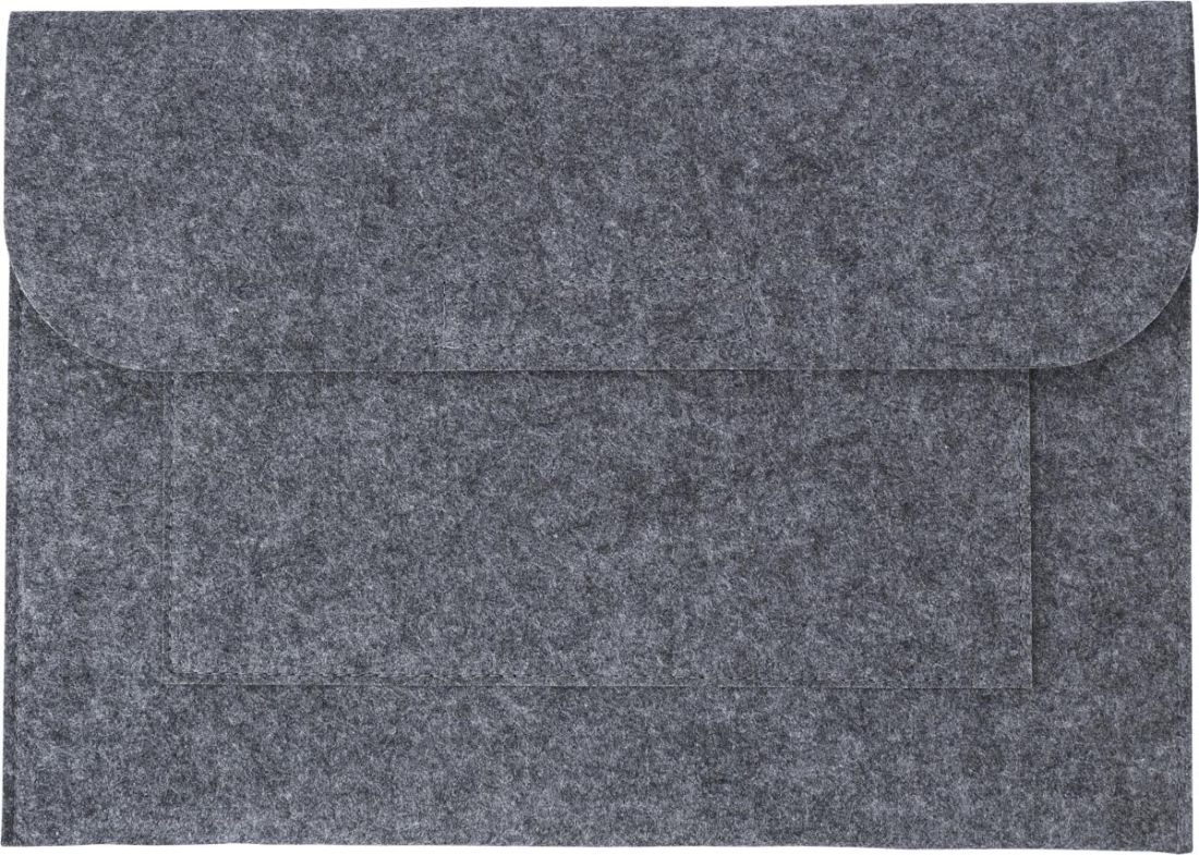 Portadocumentos de fieltro rPET con cierre de velcro. Un compartimento grande y un bolsillo delantero pequeño.