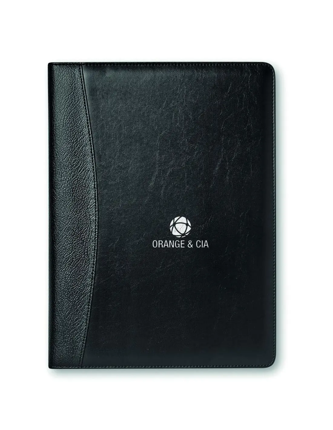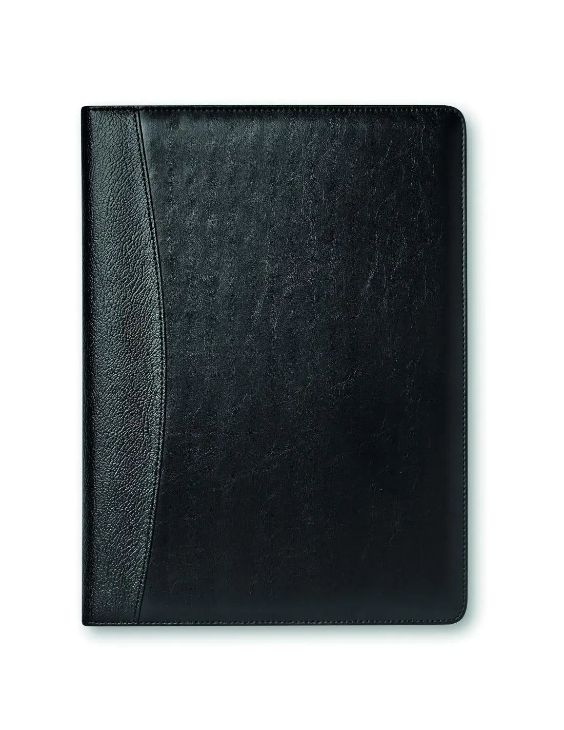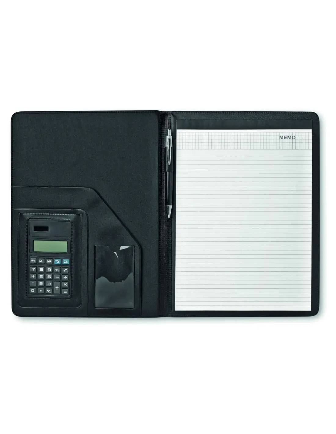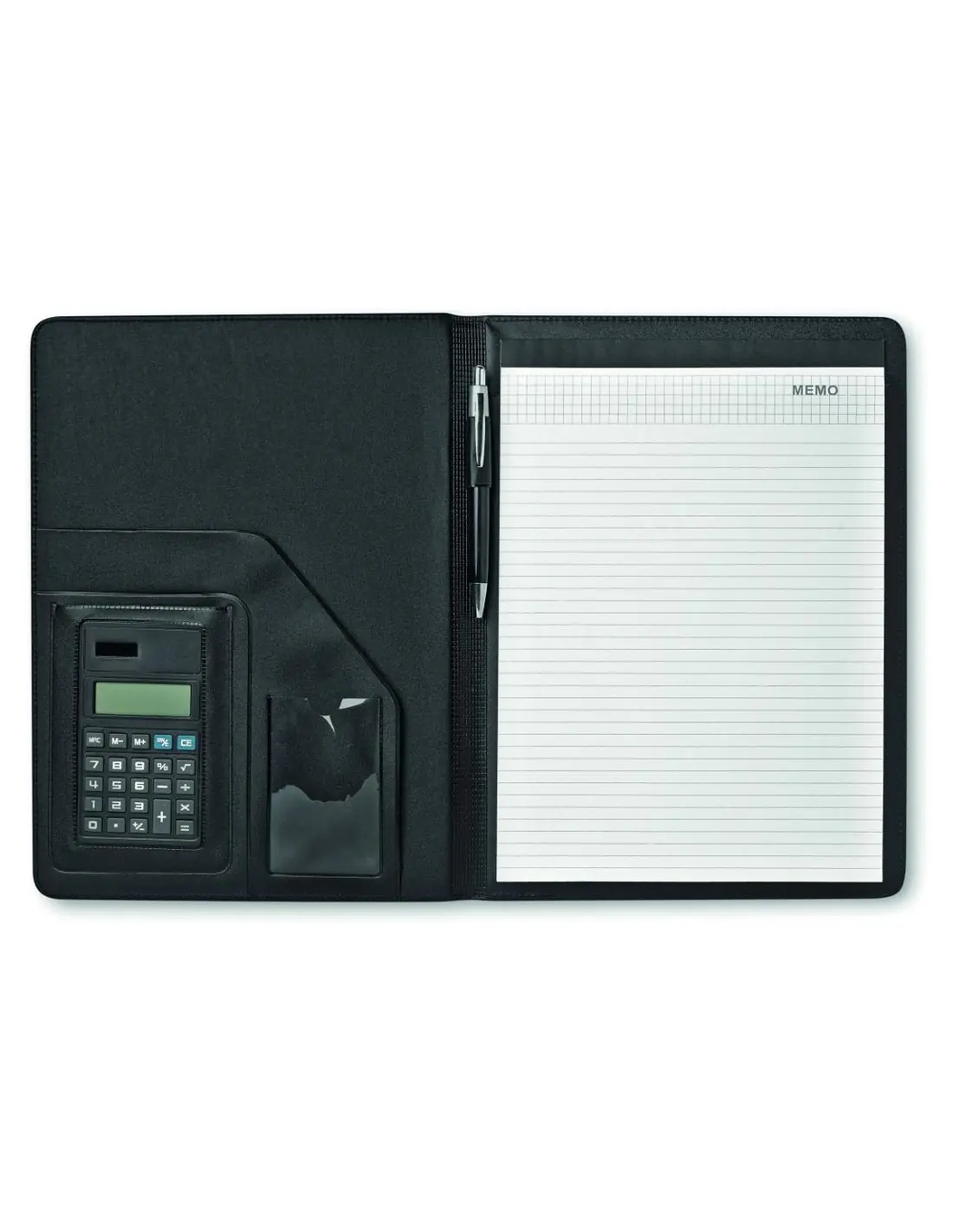 Portafolios A4 con calculadora solar, bolígrafo con tinta azul y bloc de 20 hojas con rayas. Fabricado en poli piel.