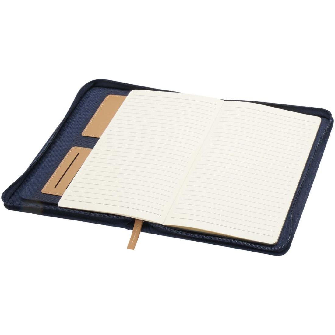 El portafolios A5 con esquinas redondeadas es un práctico artículo de oficina fabricado con plástico reciclado. Cuenta con 64 hojas rayadas color crema de 80 g/m2, cierre de cremallera, soporte para bolígrafo y bolsillo en acordeón.