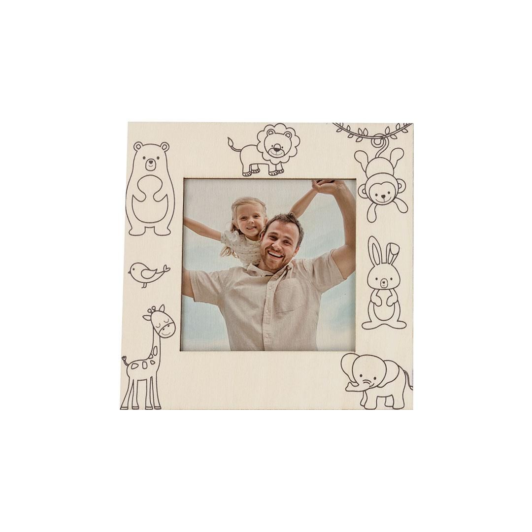 Marco de fotos fabricado en madera natural con diseño de animales. Incluye ceras de colores para personalizar y decorar el marco. Diseñado para fotografías de 7,5x7,5 cm. Cuenta con práctico soporte trasero de bisagra.
